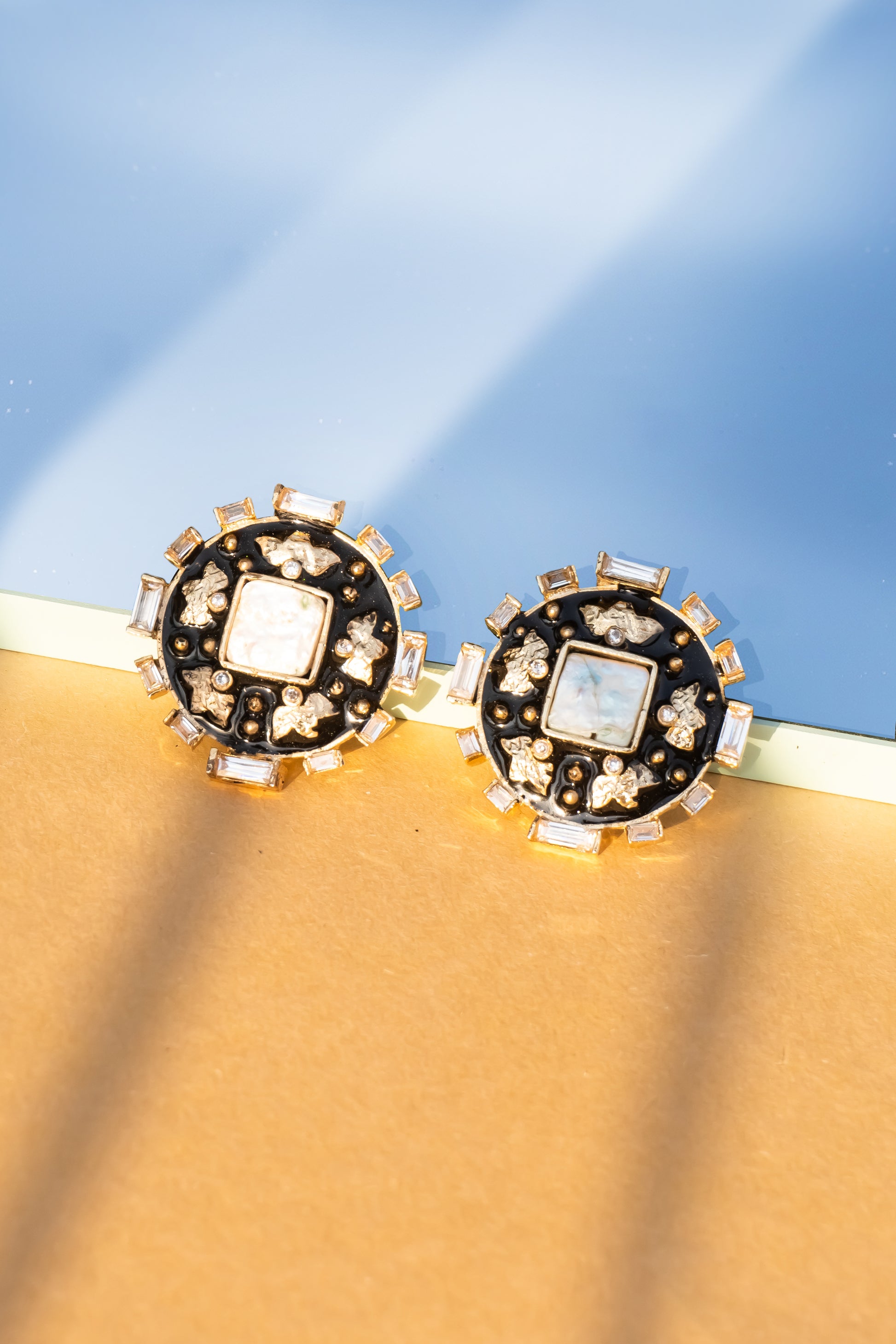 The freshwater square pearl is carefully encased in the bed of beautifully hand-textured flowers, and the handpainted black enamel is then intricately encrusted with baguettes to mark your statement.