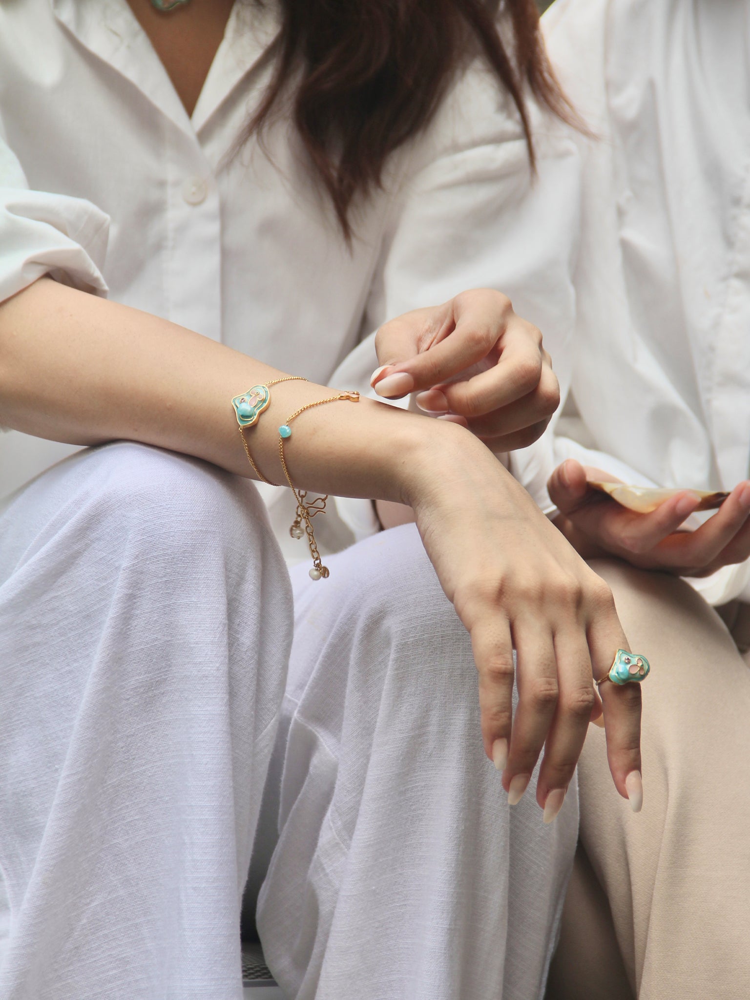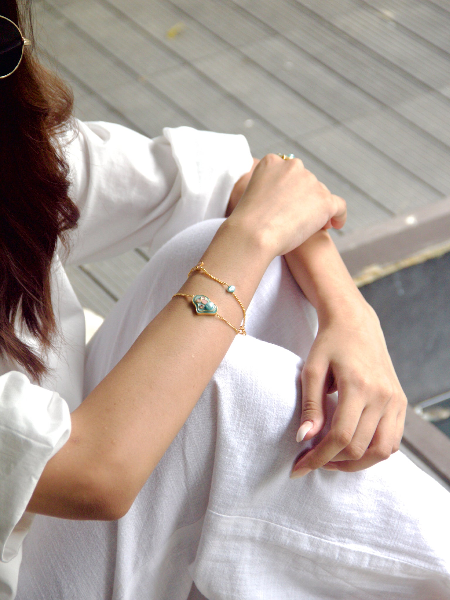 The coral tide bracelet set is a set of delicate gold chain features a stunning enamel charm in shades of blue and orange, reminiscent of a coral reef teeming with life. The charm is adorned with intricate details, adding a touch of whimsy to this elegant design.
