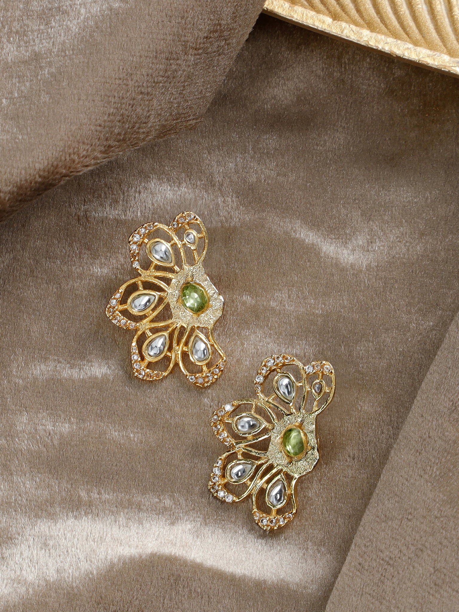 The Gulbahar earrings feature an intricate floral design with natural peridot stones, set in antique-textured metal. Embellished with sparkling zircon and kundan accents, these earrings exude vintage elegance with a modern twist, making them a captivating addition to any jewelry collection.