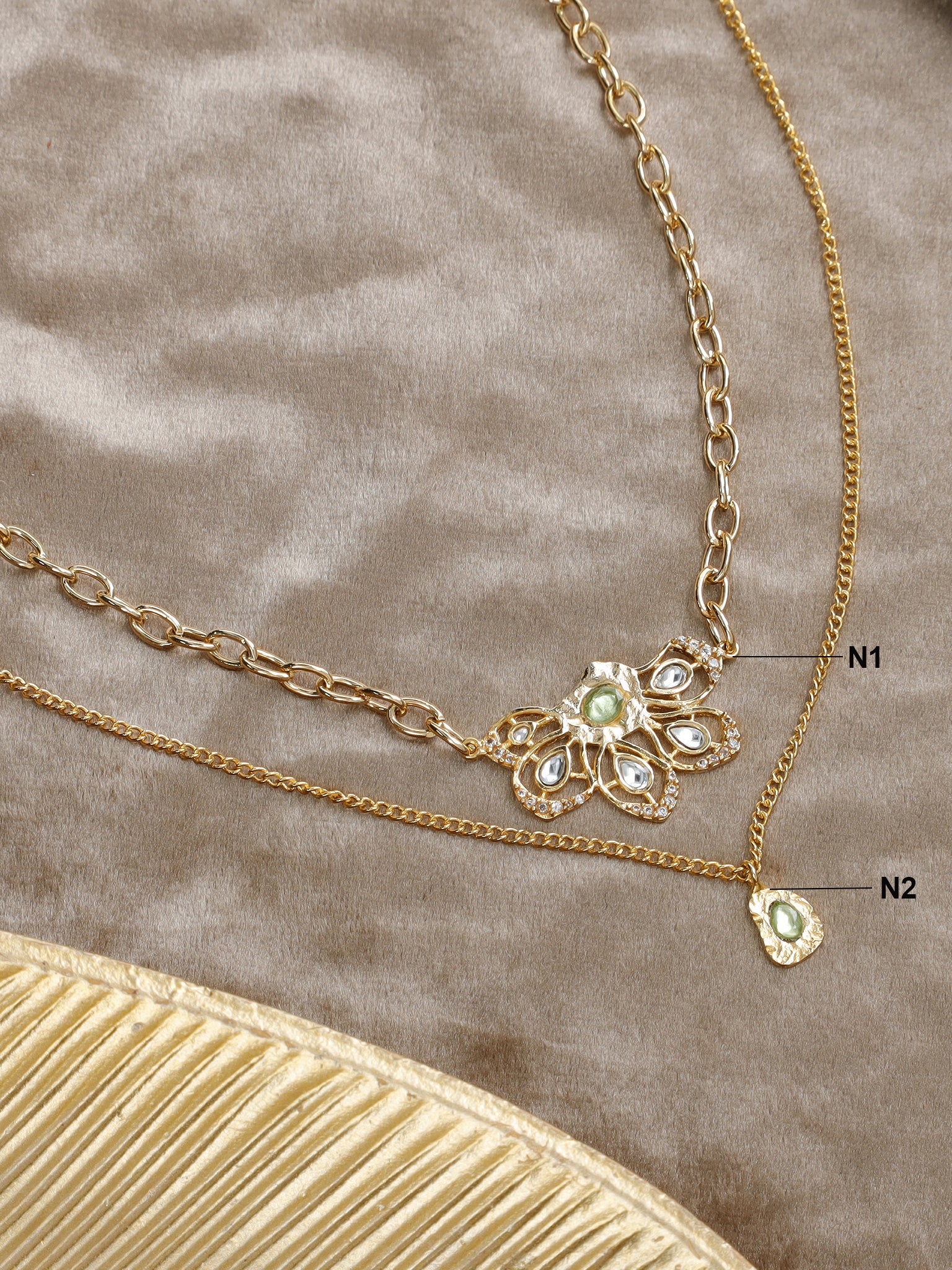 The Gulbahar chain necklace features a delicate floral design with natural peridot stone, set in antique-textured metal. Adorned with zircon and kundan accents, this elegant piece blends vintage charm with vibrant color, creating a timeless and sophisticated look.