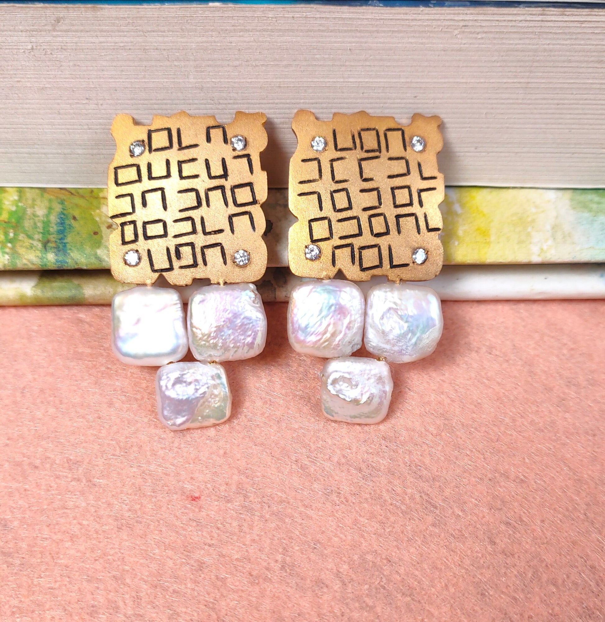 A Pair of hand engraved 21K gold plated stylized earrings. These old-fashioned earrings are surrounded by white zirconium on each corner, giving it the perfect bling.