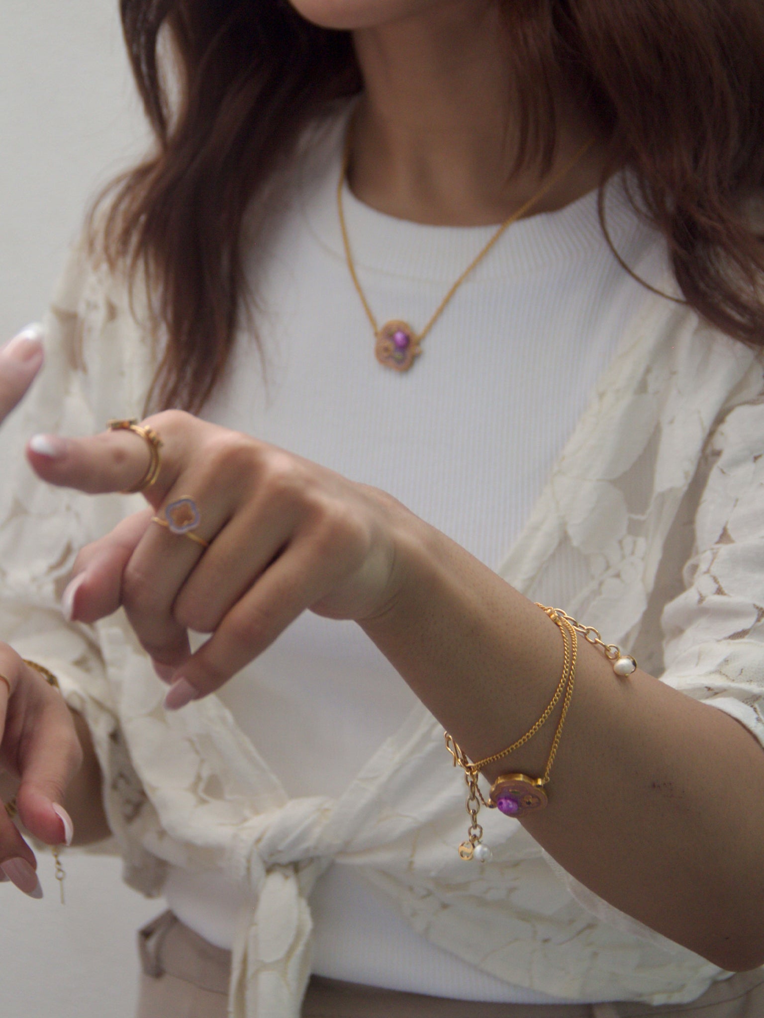 The Plum Rose Bracelet Set from the Painted Shore Collection. This elegant gold chain bracelet features a delicate flower charm with a pink gemstone center, accompanied by a smaller flower accent. The set exudes understated sophistication, perfect for everyday wear or as a thoughtful gift.