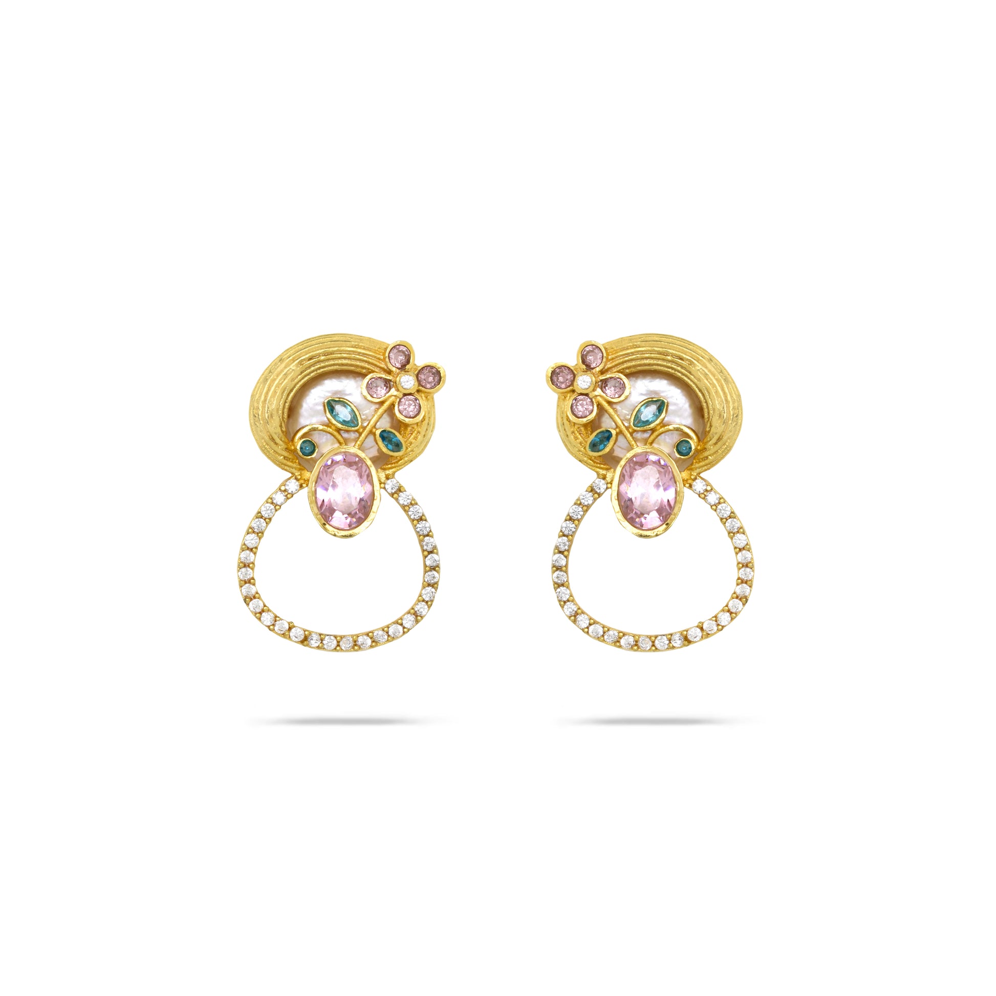 Aurora’s Kiss Earrings glow with sculptural gold textures, a luminous coin pearl, and
