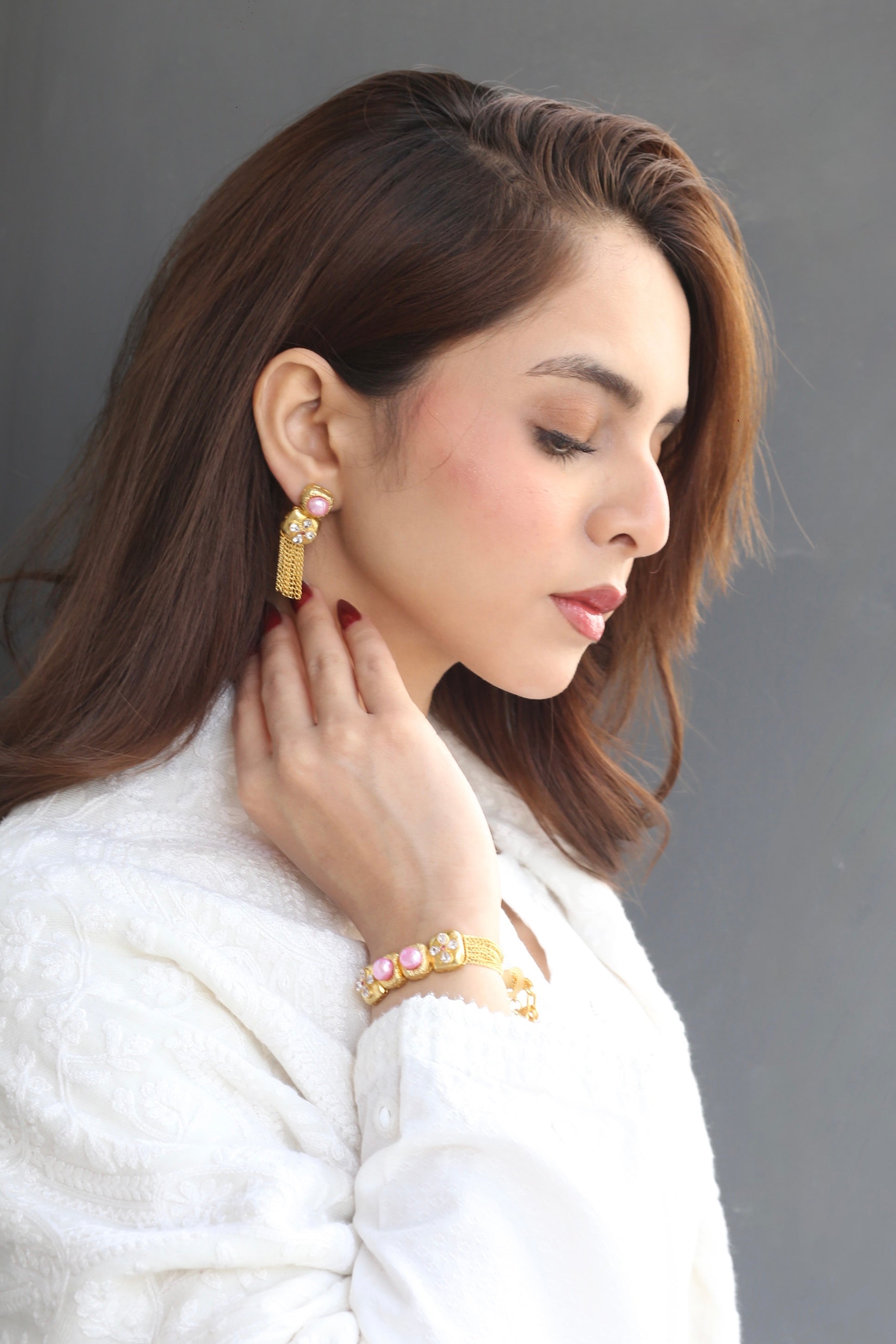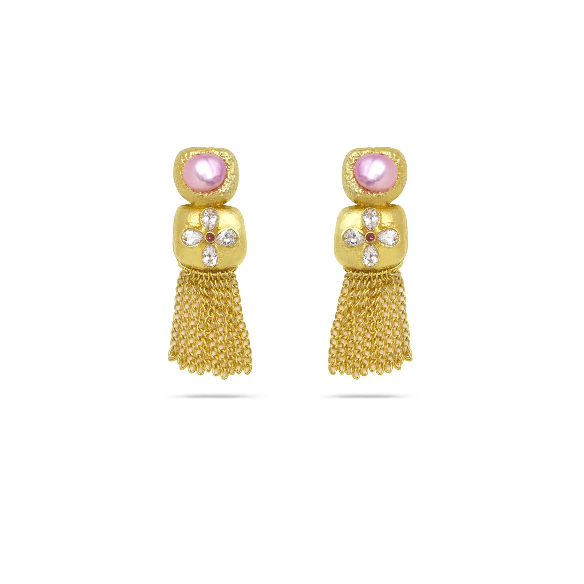 pink pearls and delicate crystal floral accents. Cascading chains create fluid