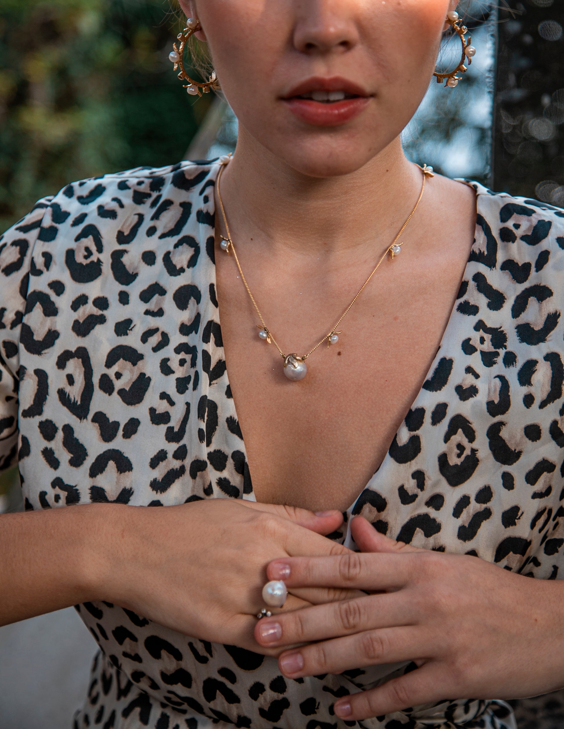 Add the classic finish to your look by pairing our Ridgy Necklace with contemporary semi-hoops, exquisitely crafted with carved leaves encrusted with white freshwater pearls and an antique finish.
