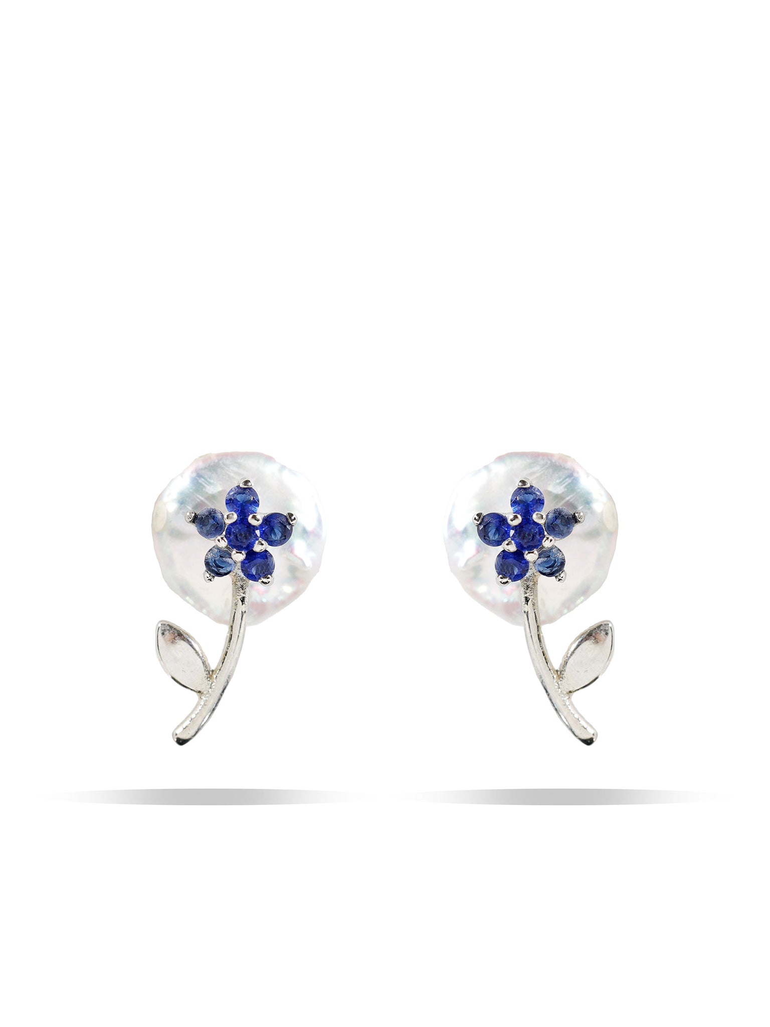 Delicate yet striking, Midnight Ice captures the quiet elegance of a moonlit garden. A luminous coin pearl forms the heart of a frosted blue flower, its petals crafted from shimmering stones that echo the chill of midnight air. A slender silver stem and a single leaf add a graceful touch, making these earrings a perfect balance of softness and structure. Cool, dreamy, and unmistakably refined — wear Midnight Ice when you want to glow in the dark.