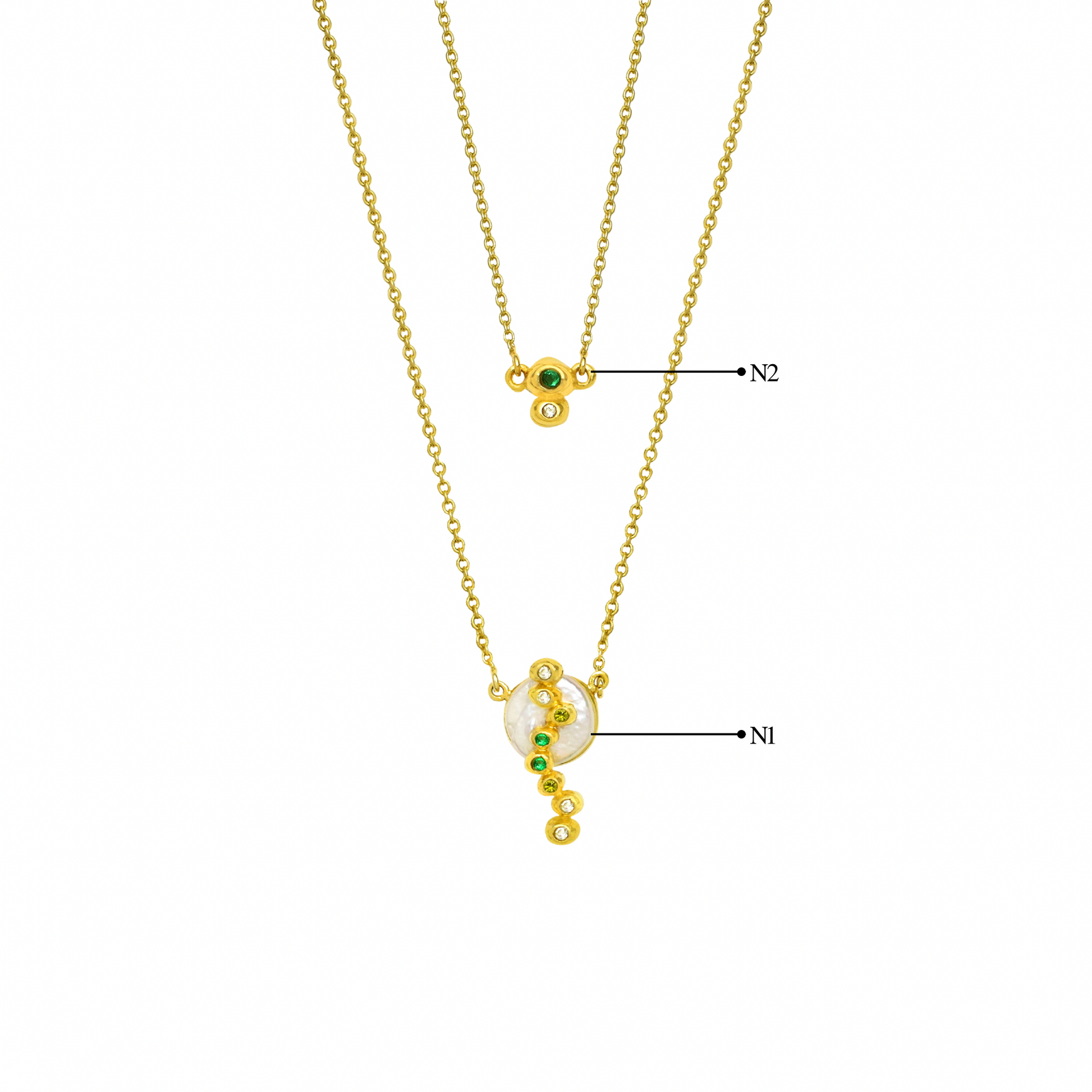 A refined yellow gold necklace featuring a radiant natural pearl centerpiece. A delicate trail of green and white stones flows across the pearl in a gentle curve, symbolizing bonds that intertwine effortlessly.
