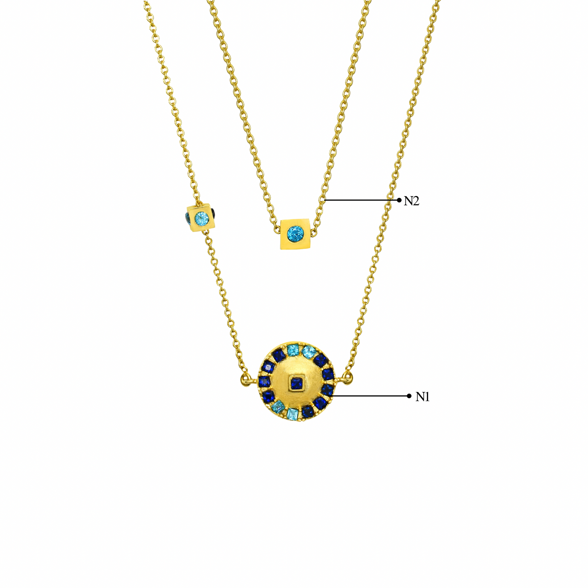 A circular gold pendant detailed with a ring of blue and aqua stones surrounding a square center stone. Balanced and eye-catching, it brings symmetry and sparkle to the neckline.