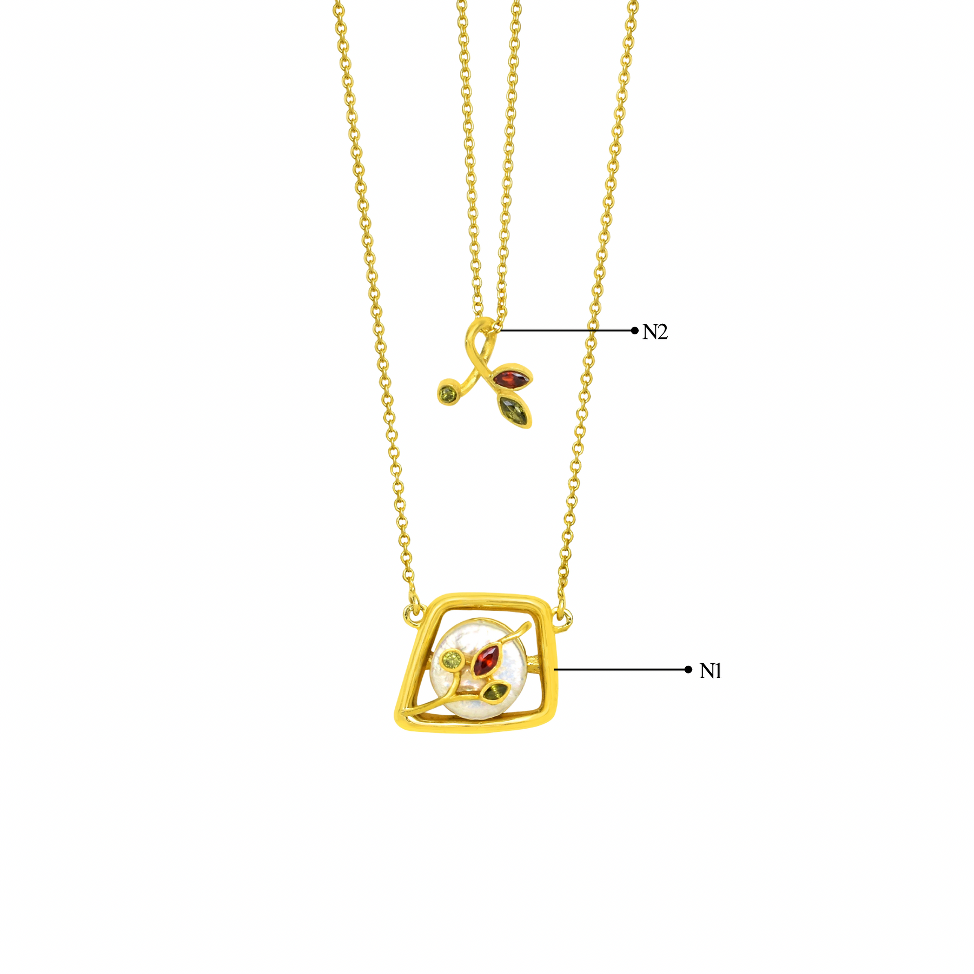 Featuring a luminous coin pearl paired with a sculptural open gold element and delicate red and green stone accents, this piece blends structure with fluid