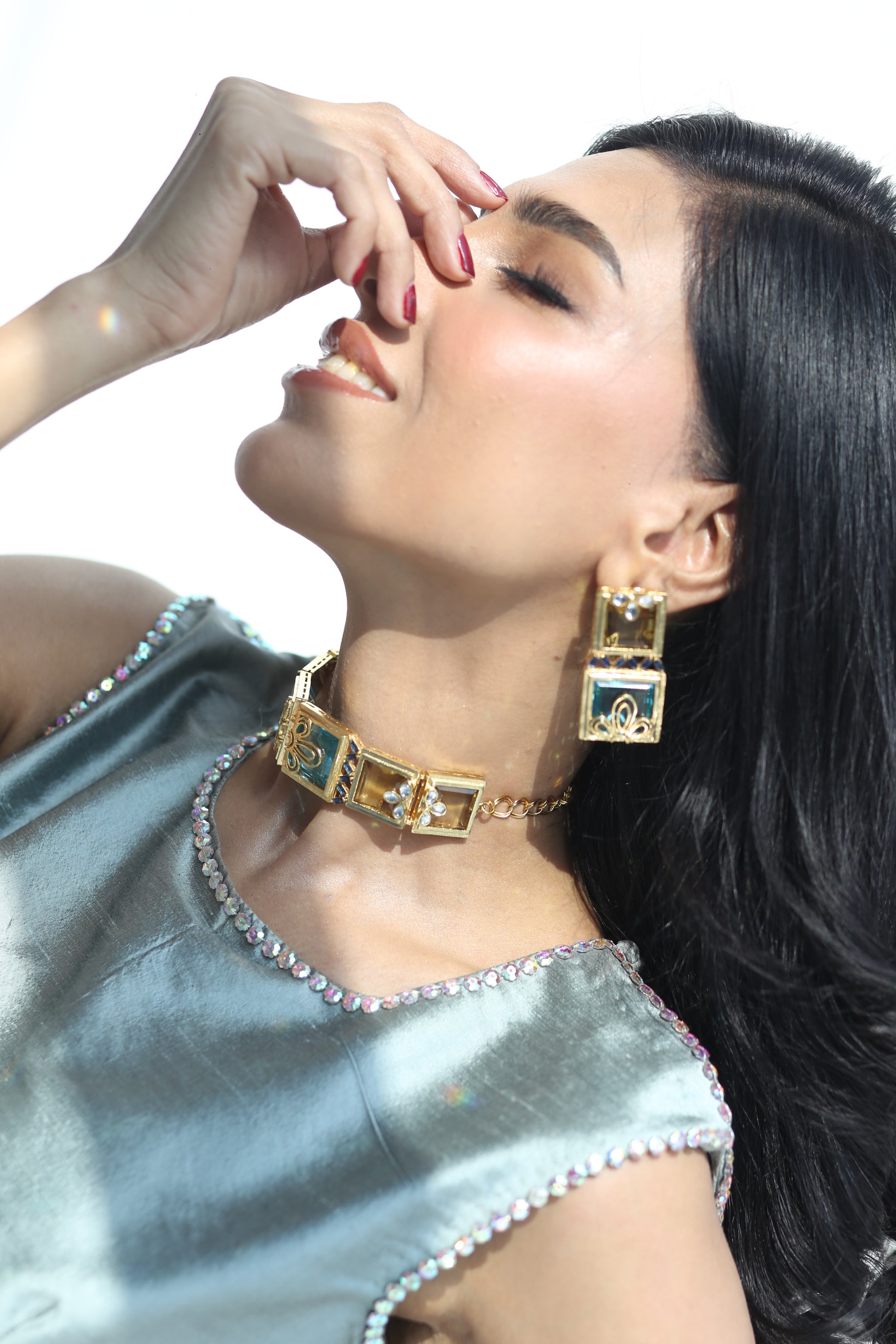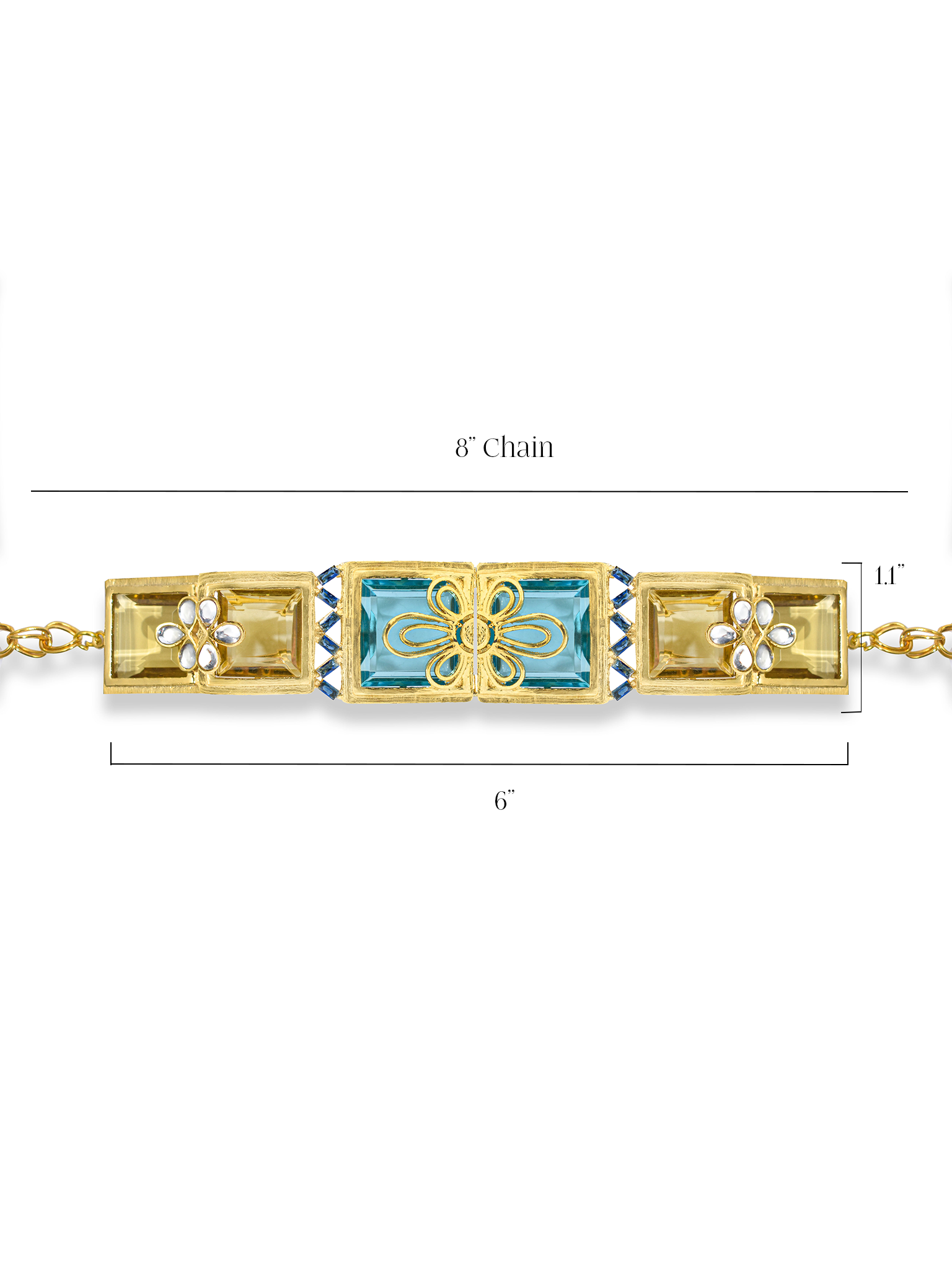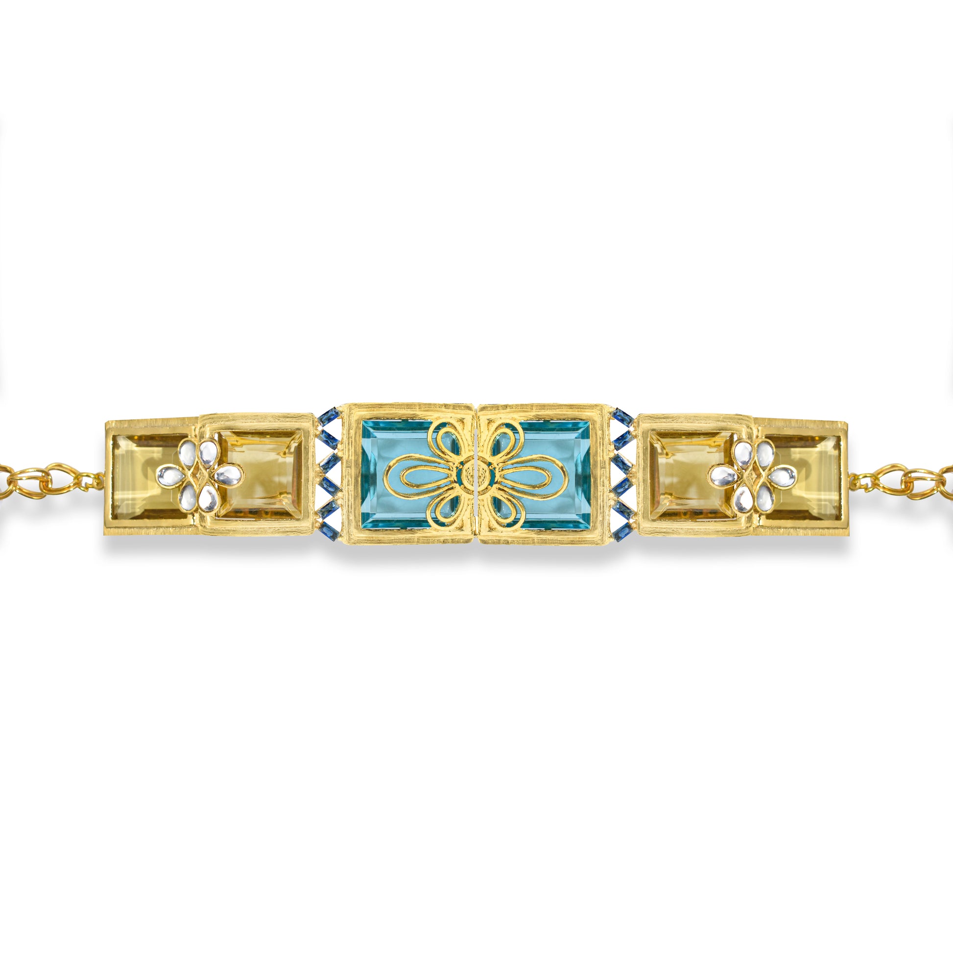 Aqua Gleam choker – a gold rectangular-link necklace with three sleek panels: a central aqua-blue gemstone framed by a gold bow, flanked by two gold rectangles inset with floral motifs and angular baguette settings holding it beautifully.
