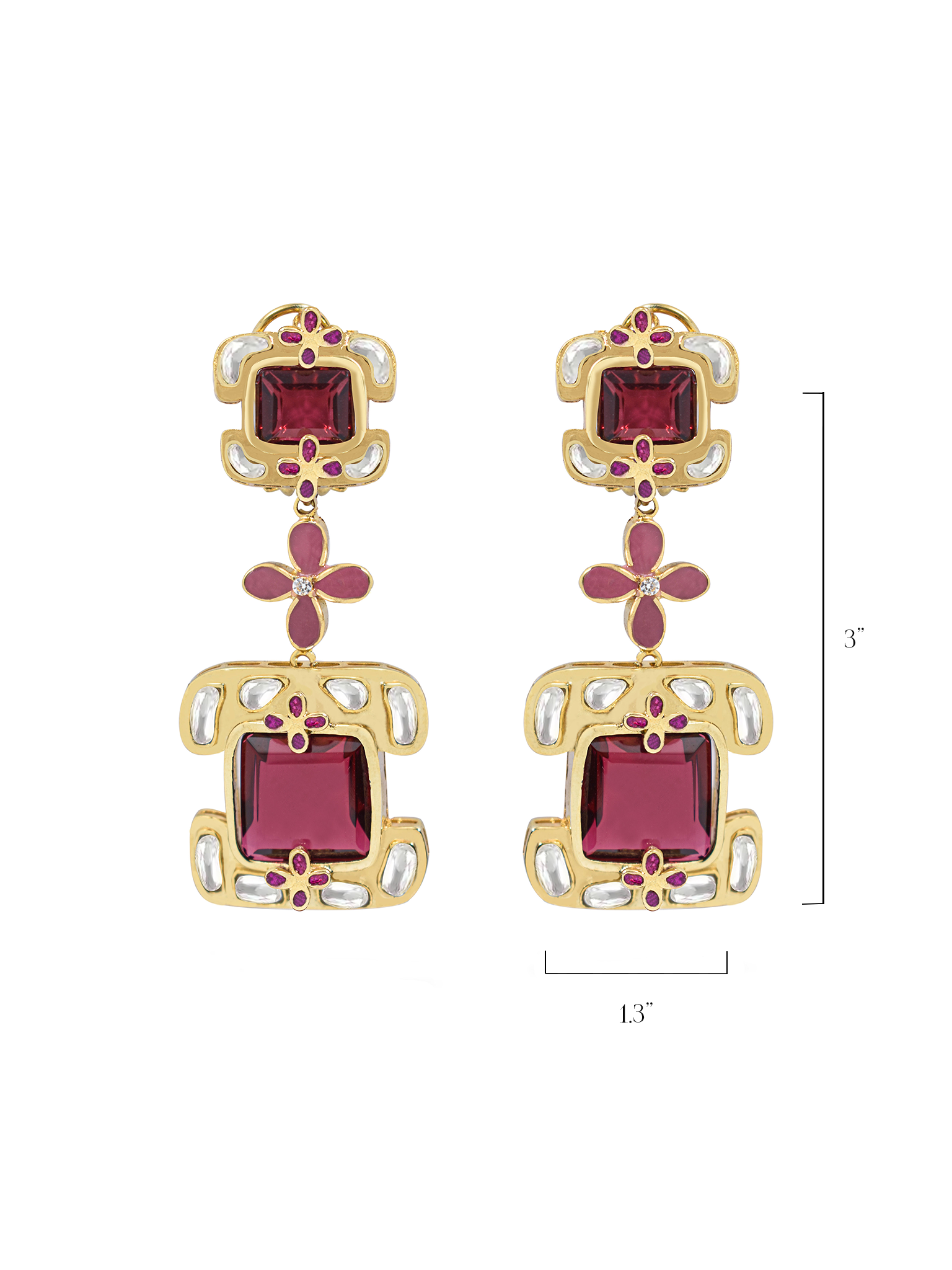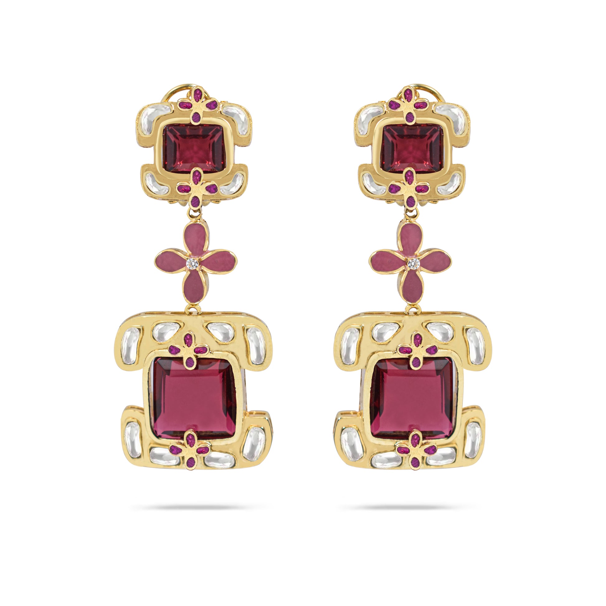 Fuchsia Glow earrings from the new Prismatic Affairs collection are striking gold-tone drop earrings featuring vibrant fuchsia square stones accented with sparkling white gems and delicate ruby-red details. The layered, geometric design gives a luminous, glamorous look that adds a bold pop of color to any outfit.