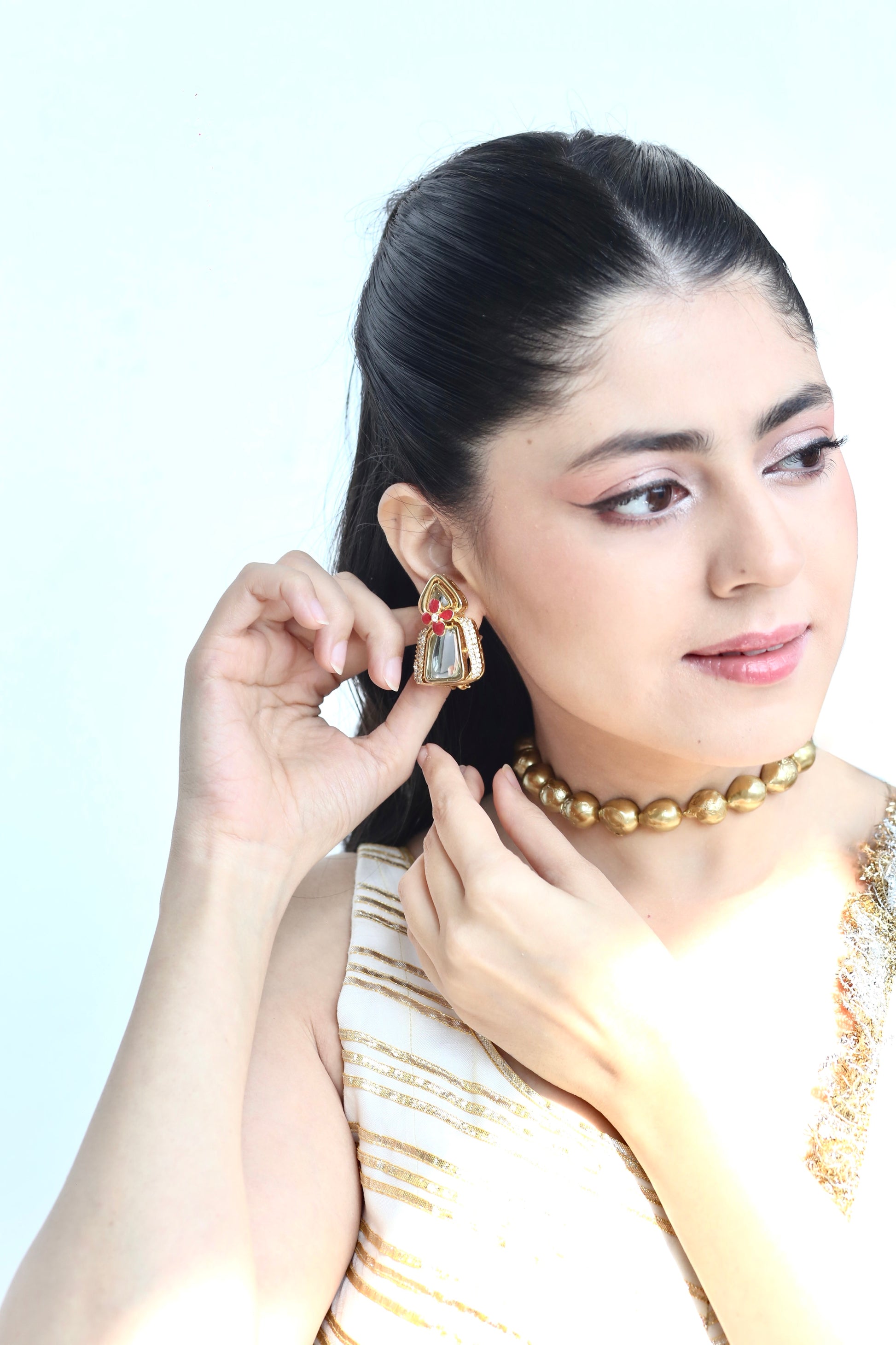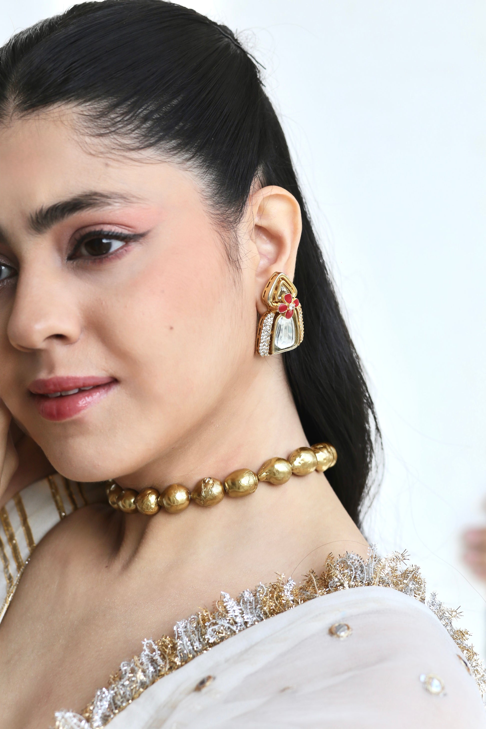 Ruby Rose earrings from the Prismatic Affairs collection – gold‑tone studs featuring a central crystal rose set with vibrant red ruby enameled petals and sparkling white zircon accents, framed by diamond‑cut side detailing for a luxurious, floral‑inspired statement.