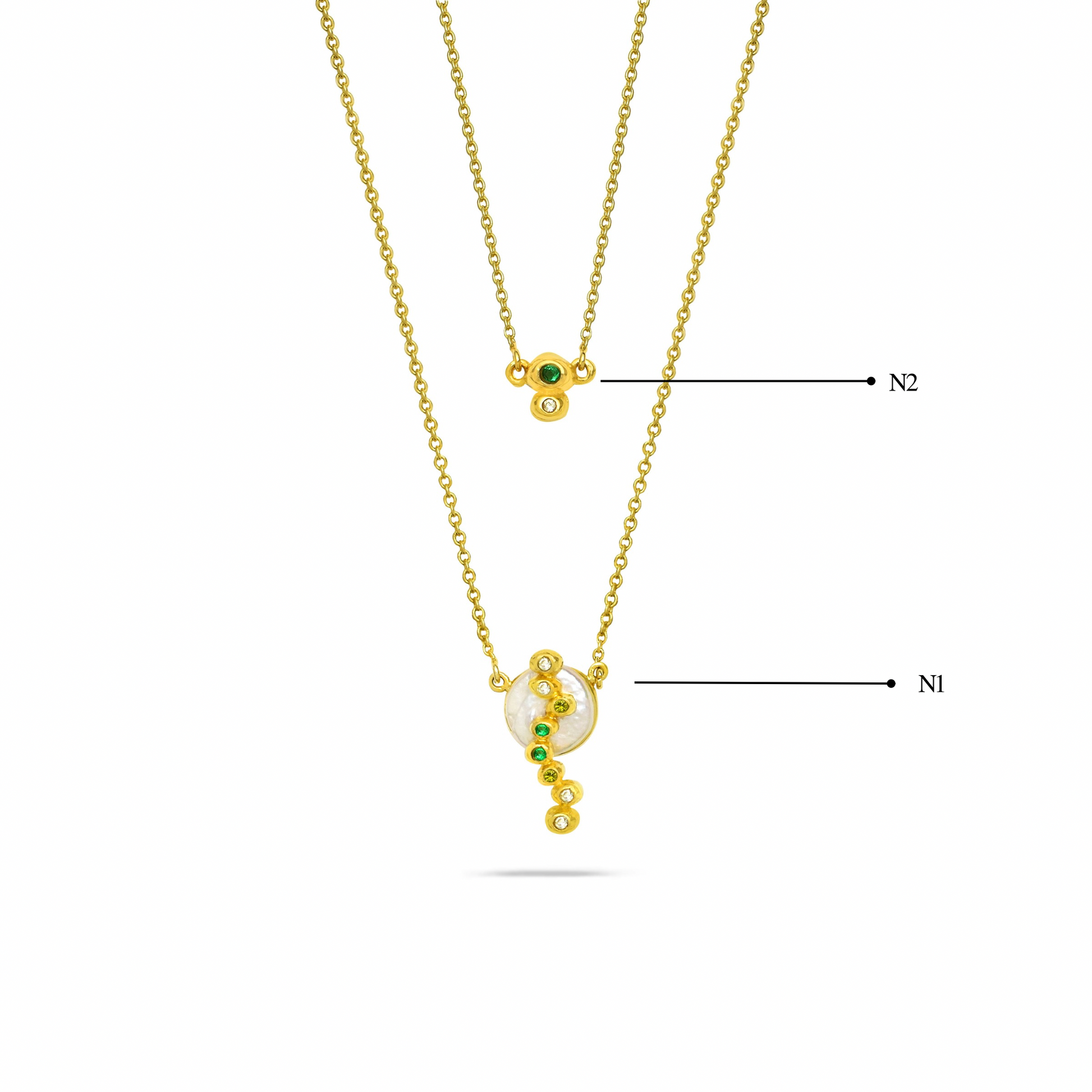 A refined yellow gold necklace featuring a radiant natural pearl centerpiece. A delicate trail of green and white stones flows across the pearl in a gentle curve, symbolizing bonds that intertwine effortlessly.