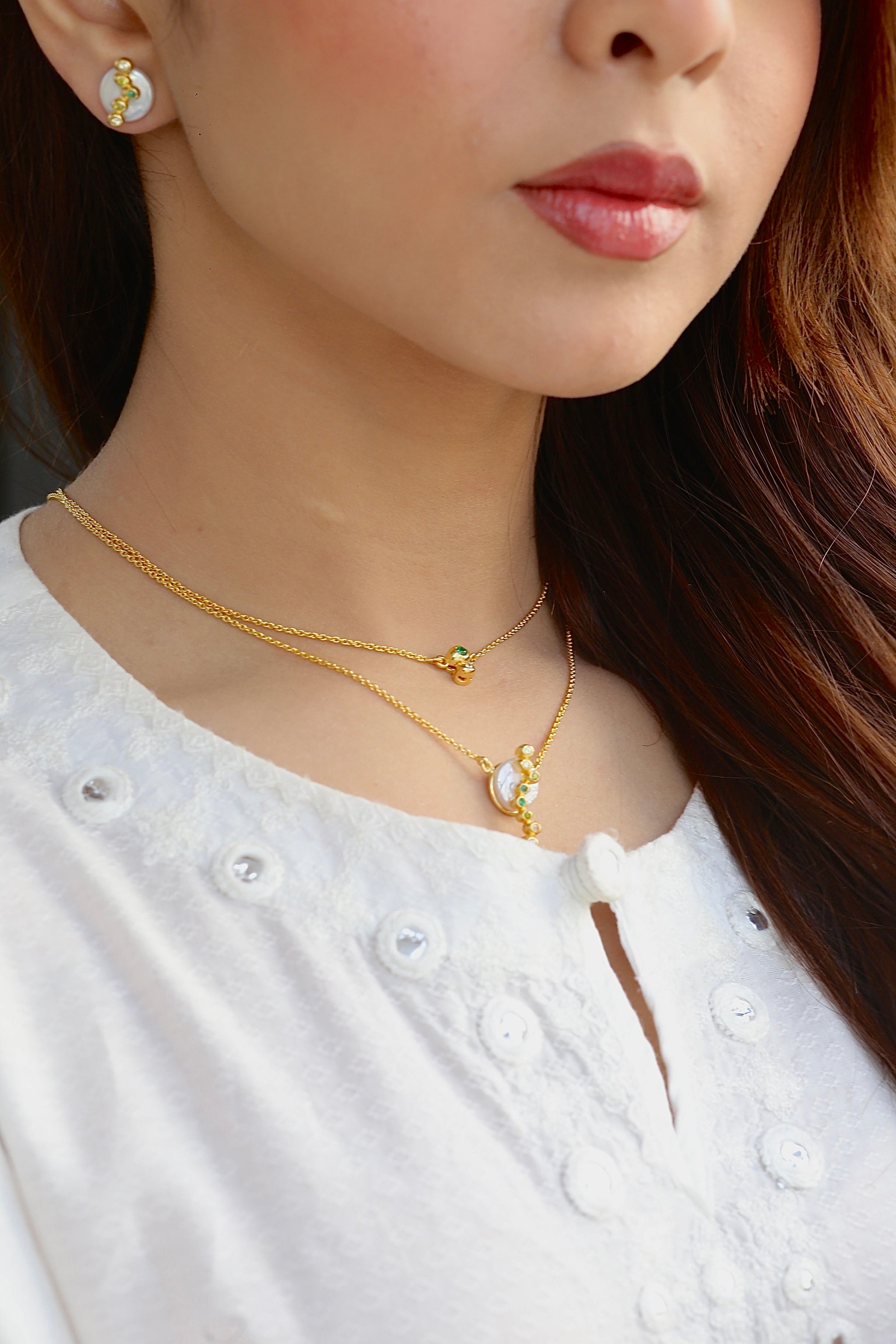 A dainty yellow gold chain adorned with a petite arrangement of green and white stones at its center. Minimal yet meaningful, this necklace mirrors the set’s flowing motif in a softer, understated way