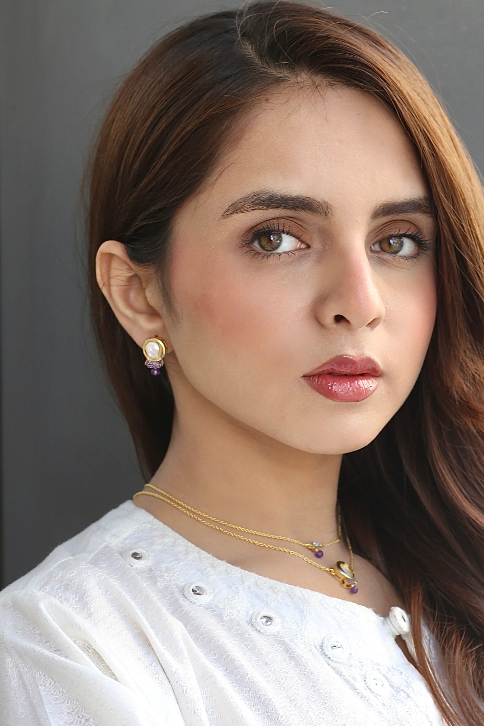 These sculpted gold earrings cradle an organically shaped baroque pearl at the center, celebrating its natural texture and luminous glow. A crescent of pavé-set violet stones rests beneath the pearl, finished with a single dangling purple drop that adds soft movement and depth. Bold yet romantic, they frame the face with warmth and character.