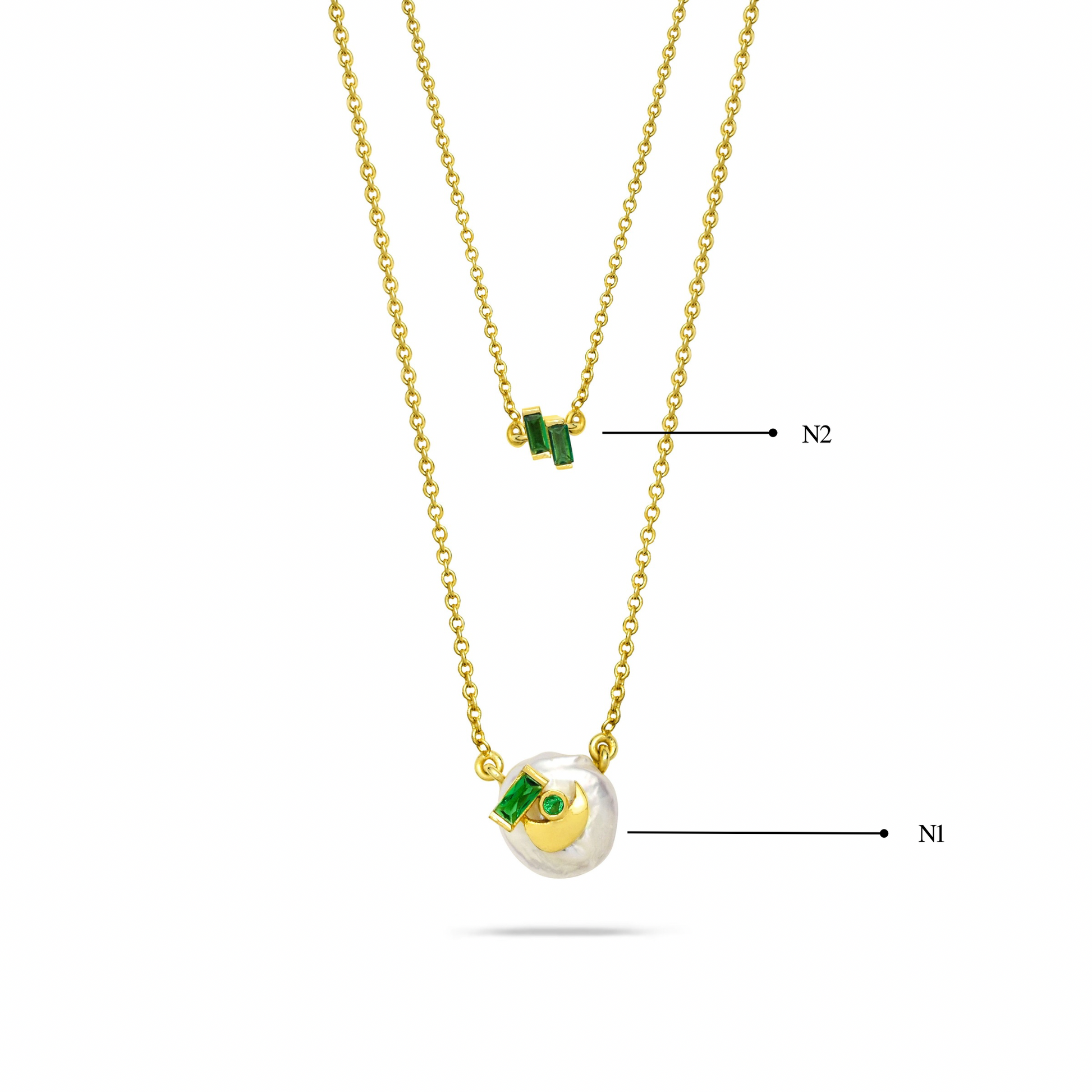 Two emerald-green baguette stones sit side by side on a delicate gold chain, creating a sleek, contemporary focal point. Minimal, refined, and perfect for layering.