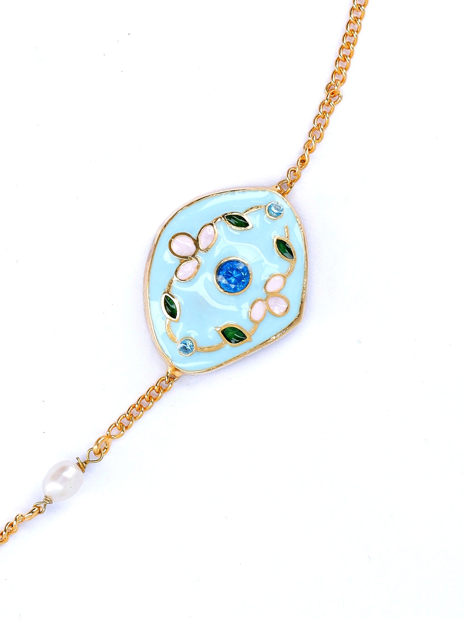 This stunning bracelet showcases sparkling zircon stones and intricate hand painted details making each piece unique.