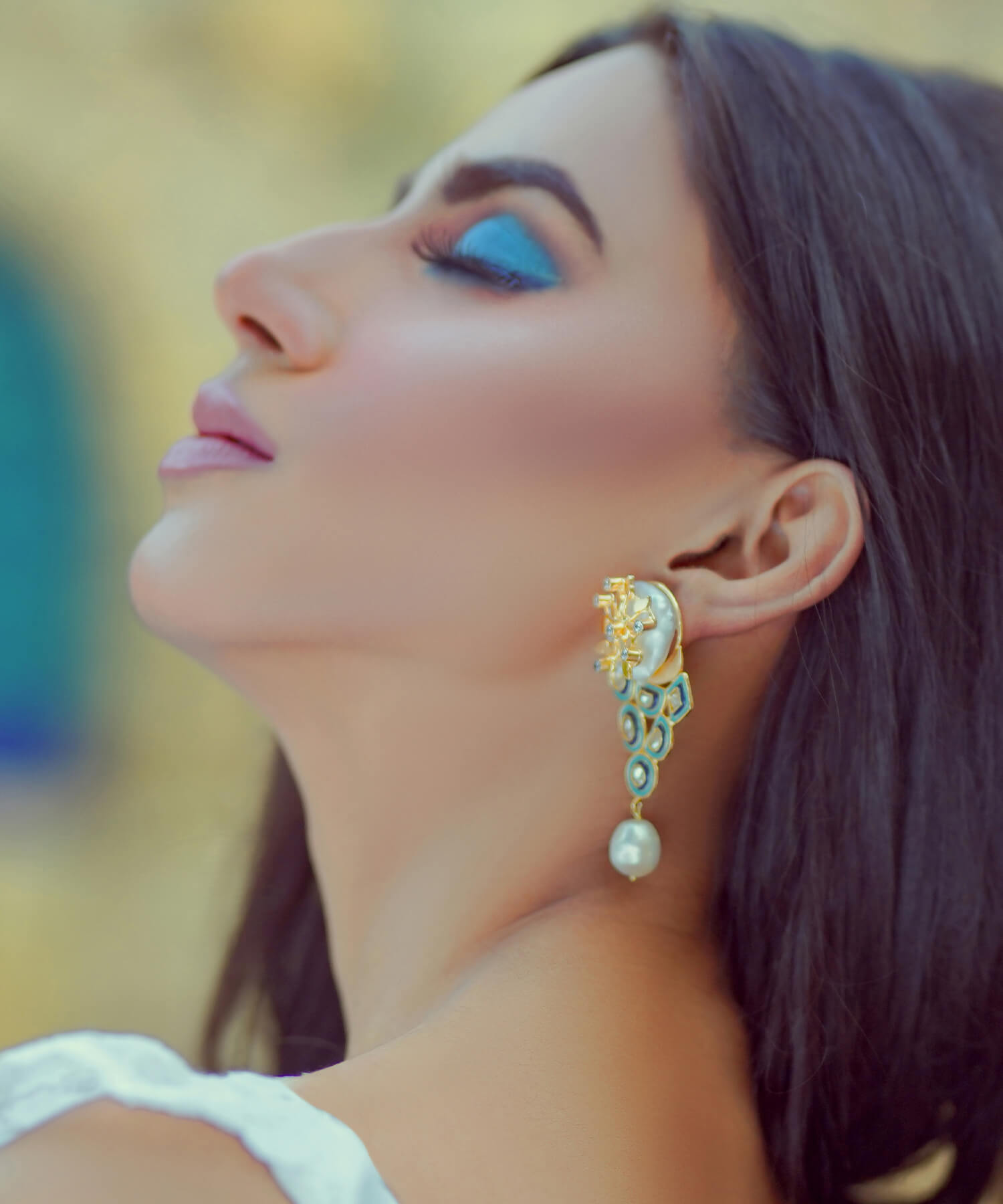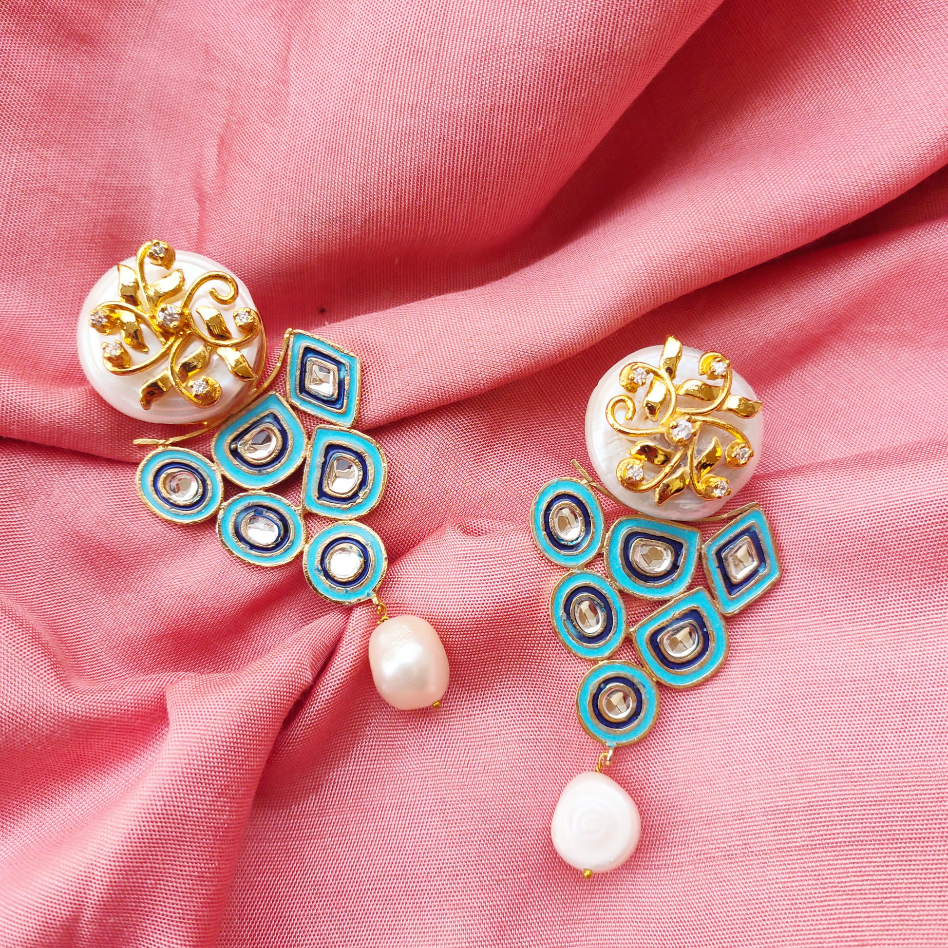This eccentric piece of art is a fusion of chic and glamorous details, embellished with Kundan, Zircon and real Freshwater Baroque and Oval pearls.