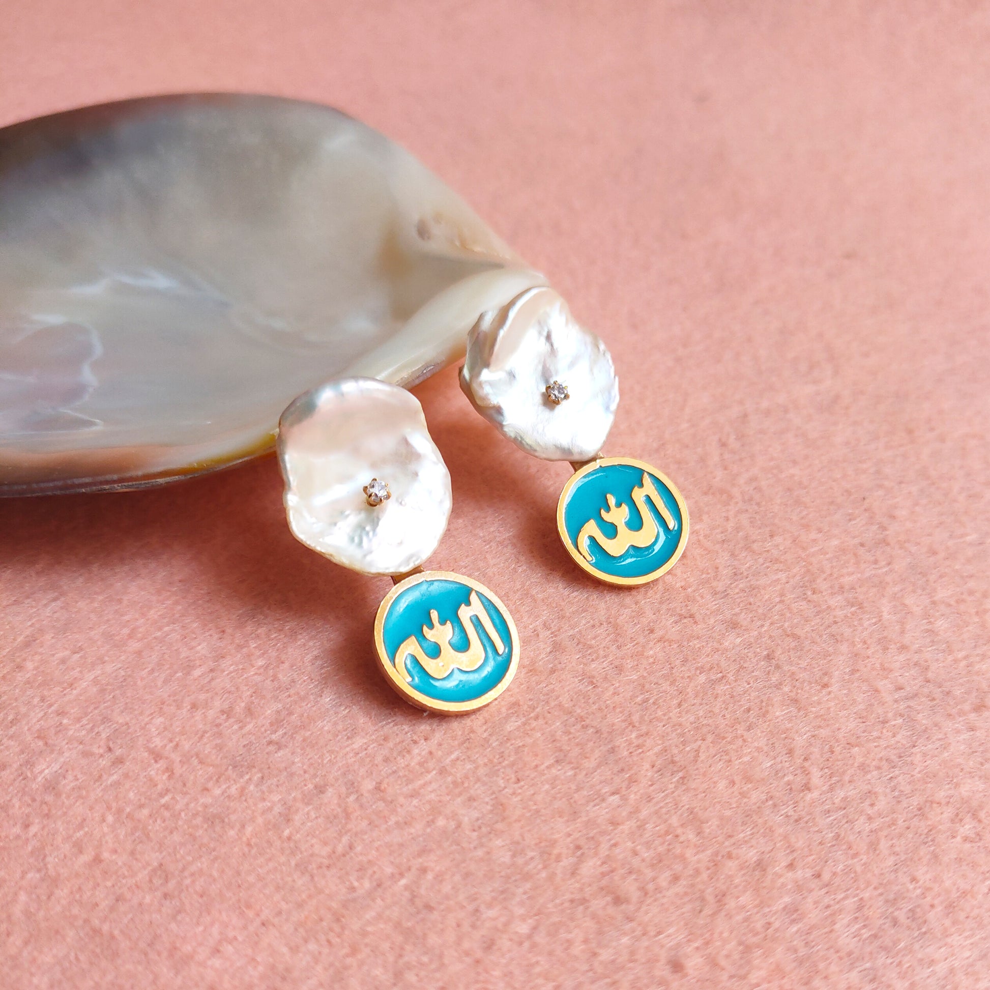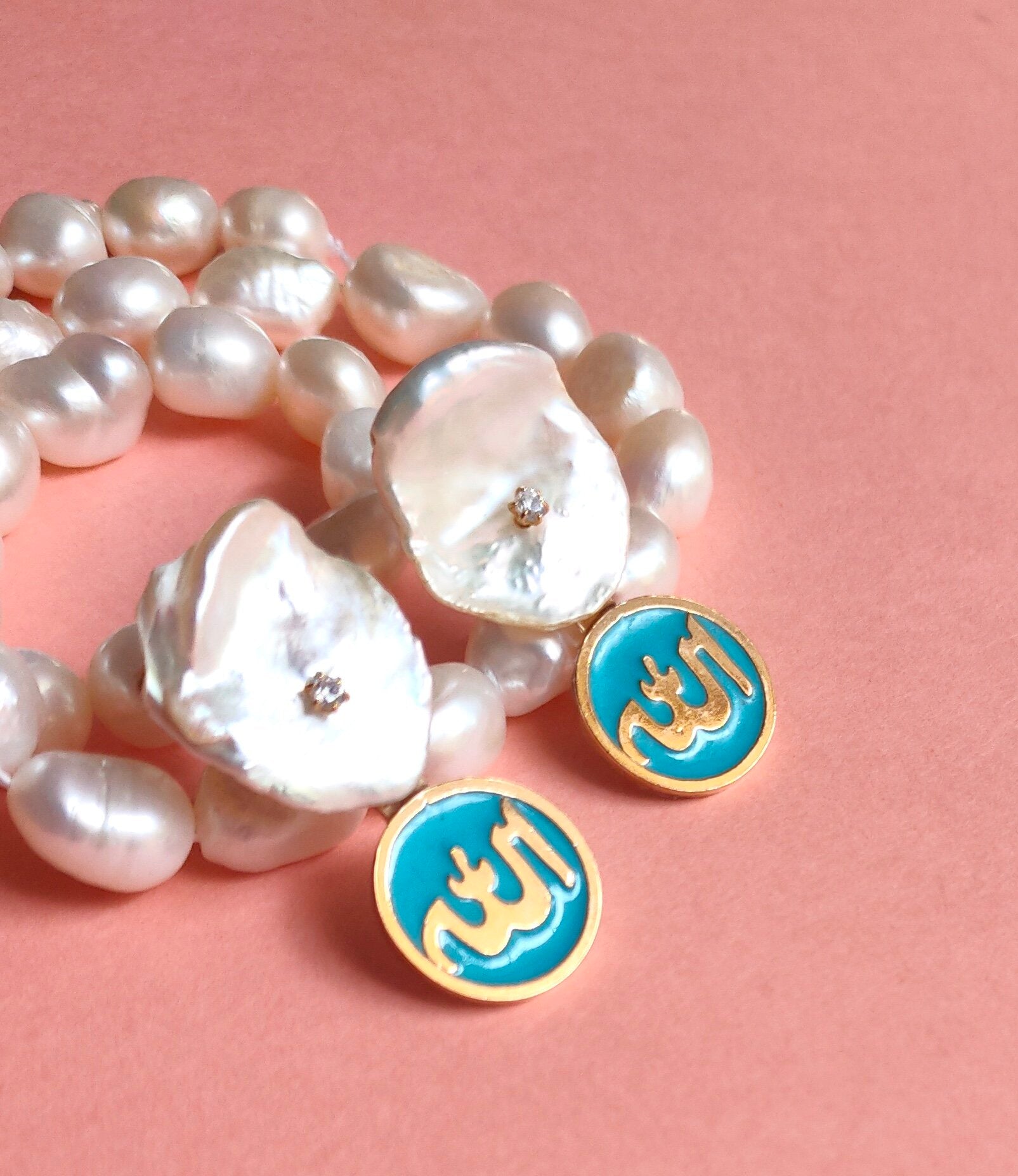 ‘Merciful’ – We say this name before we eat, in our prayers, and numerous other times throughout the day. Intricately enameled earrings with beautiful Keshi pearls. The Arabic Calligraphy with Allah’s (SWT) name brings all the glory you need.