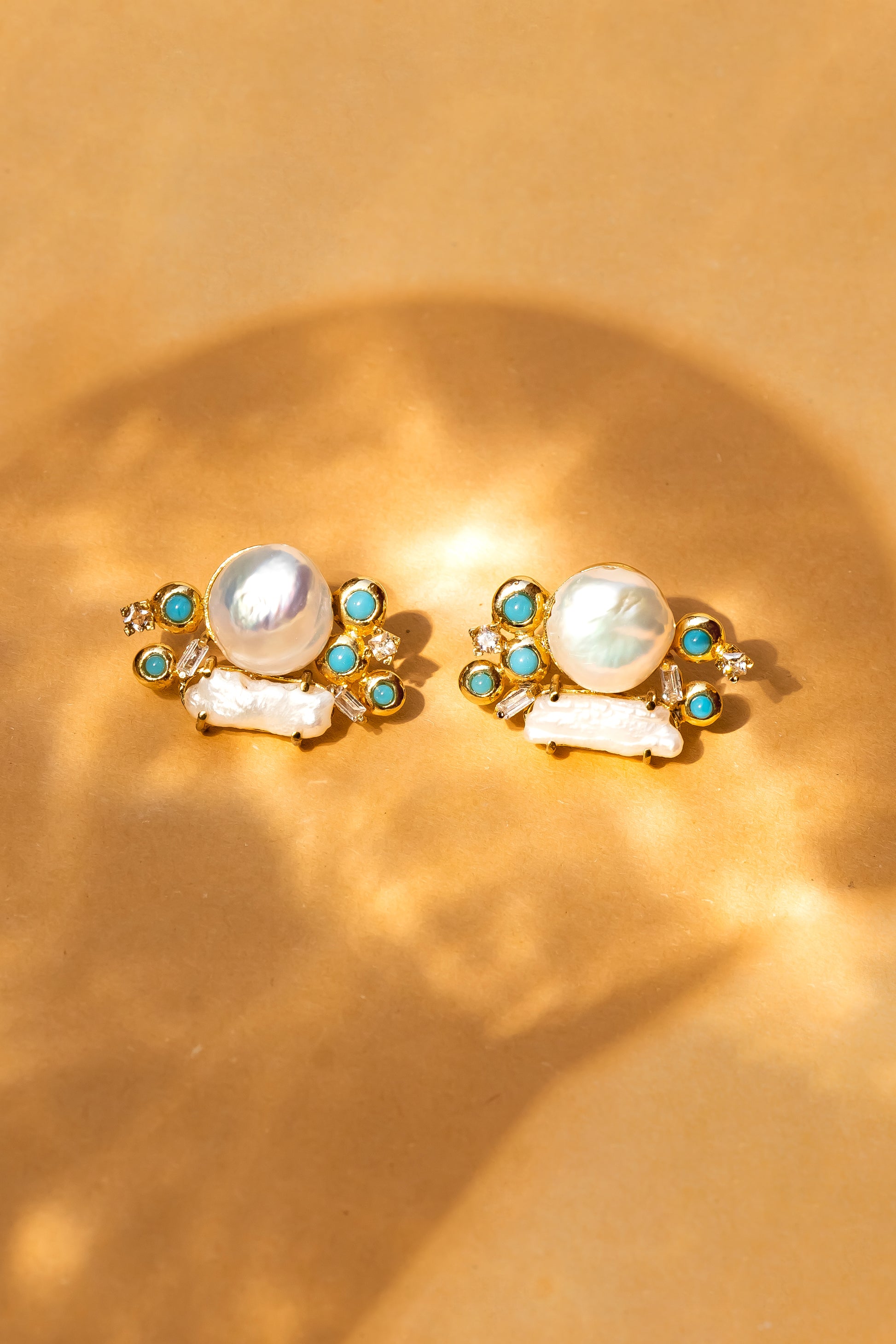 The versatile combination of coin and biwa freshwater pearls is studded with zircons and turquoise stones in a captivating setting of textured gold to add glamour to your look.