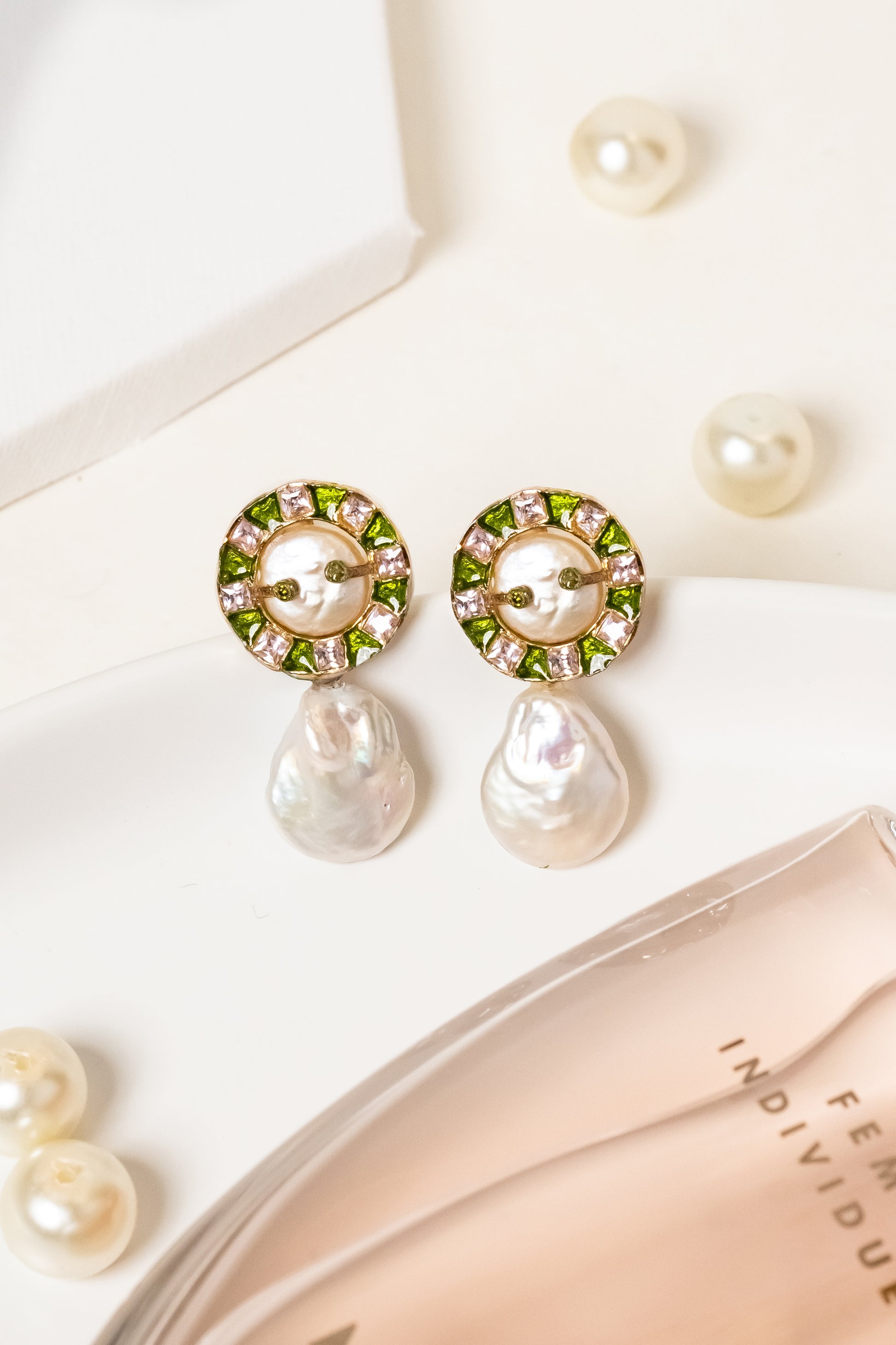 A stunning everyday casual earring. Unique pastel combination of stones and enamel. The white freshwater drop pearl adds to the look.