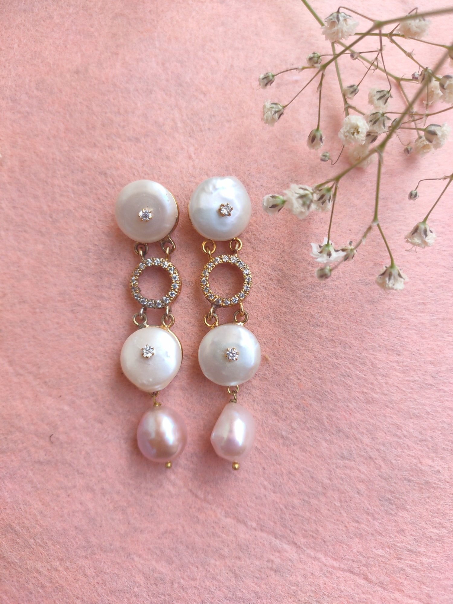 Make a statement with the circular rings connected together to elevate your everyday look. The dangly pink baroque pearls at the end, add to the sophistication.