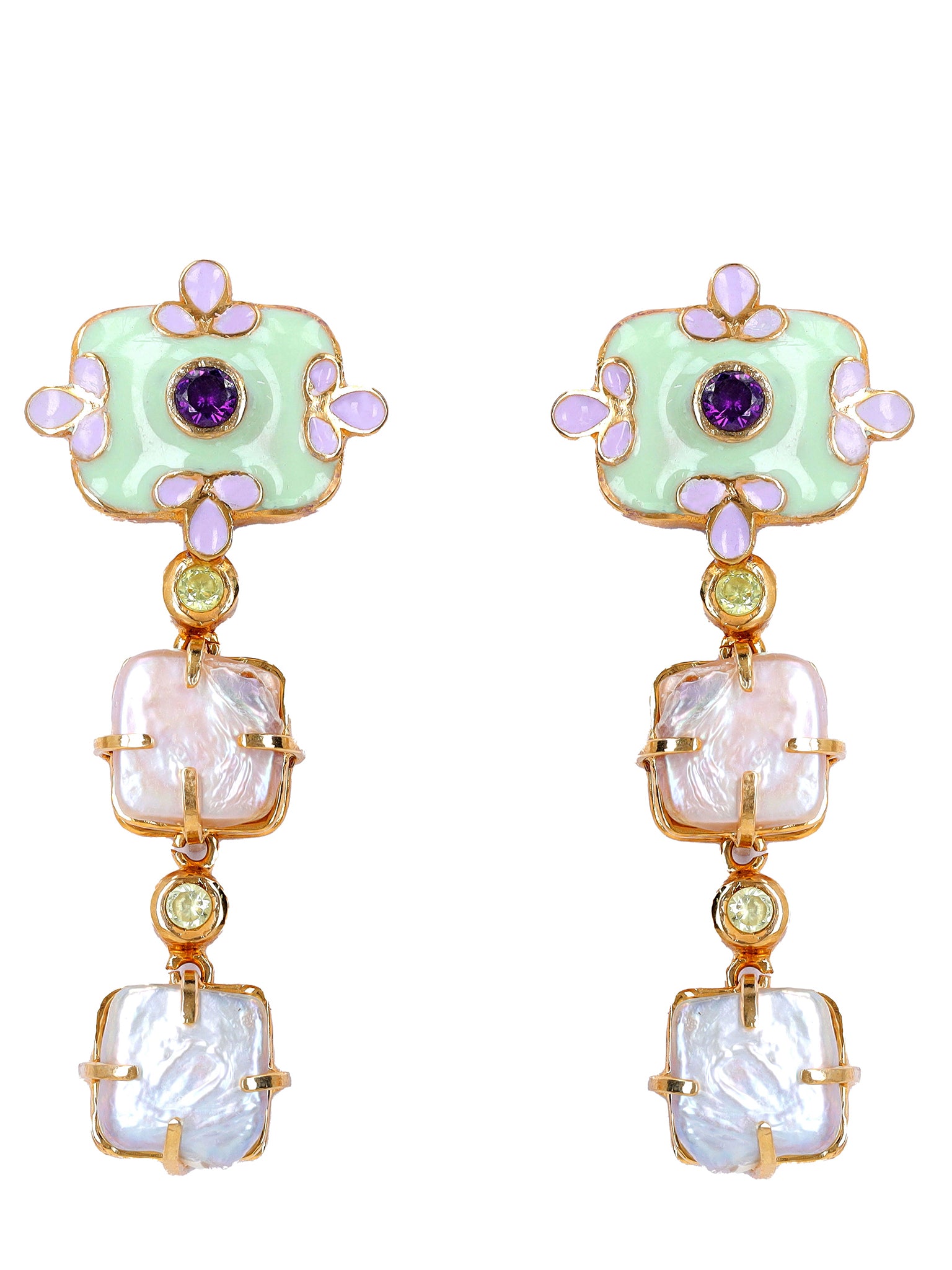 These elegant clover earrings feature real freshwater square pearls, spakrling zircon stones and hand painted details.