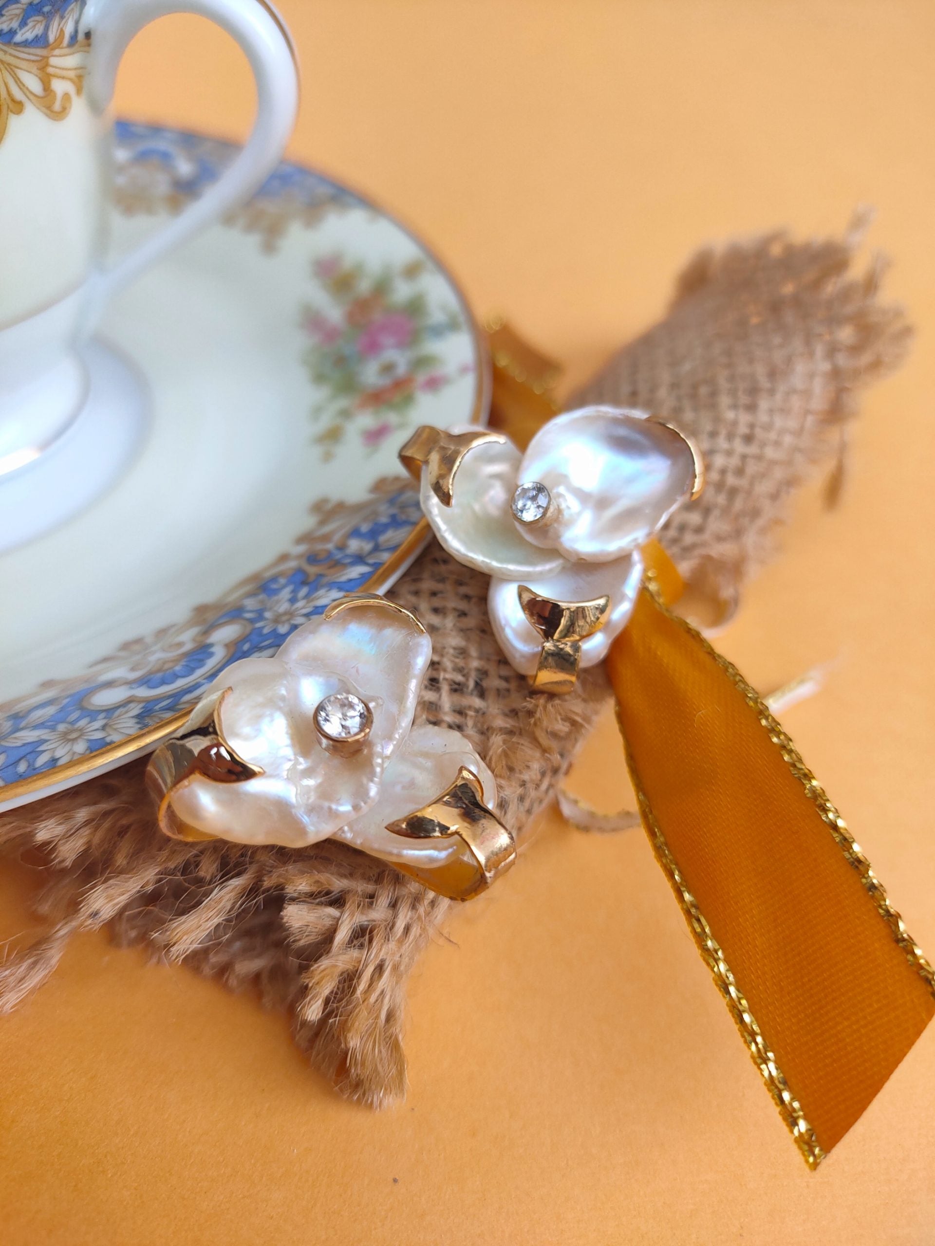 Ruffled Keshi pearls are stacked together to form these dreamy stud earrings. A Zircon Crystal in the center adds shine, luminance and focus to this beauty!