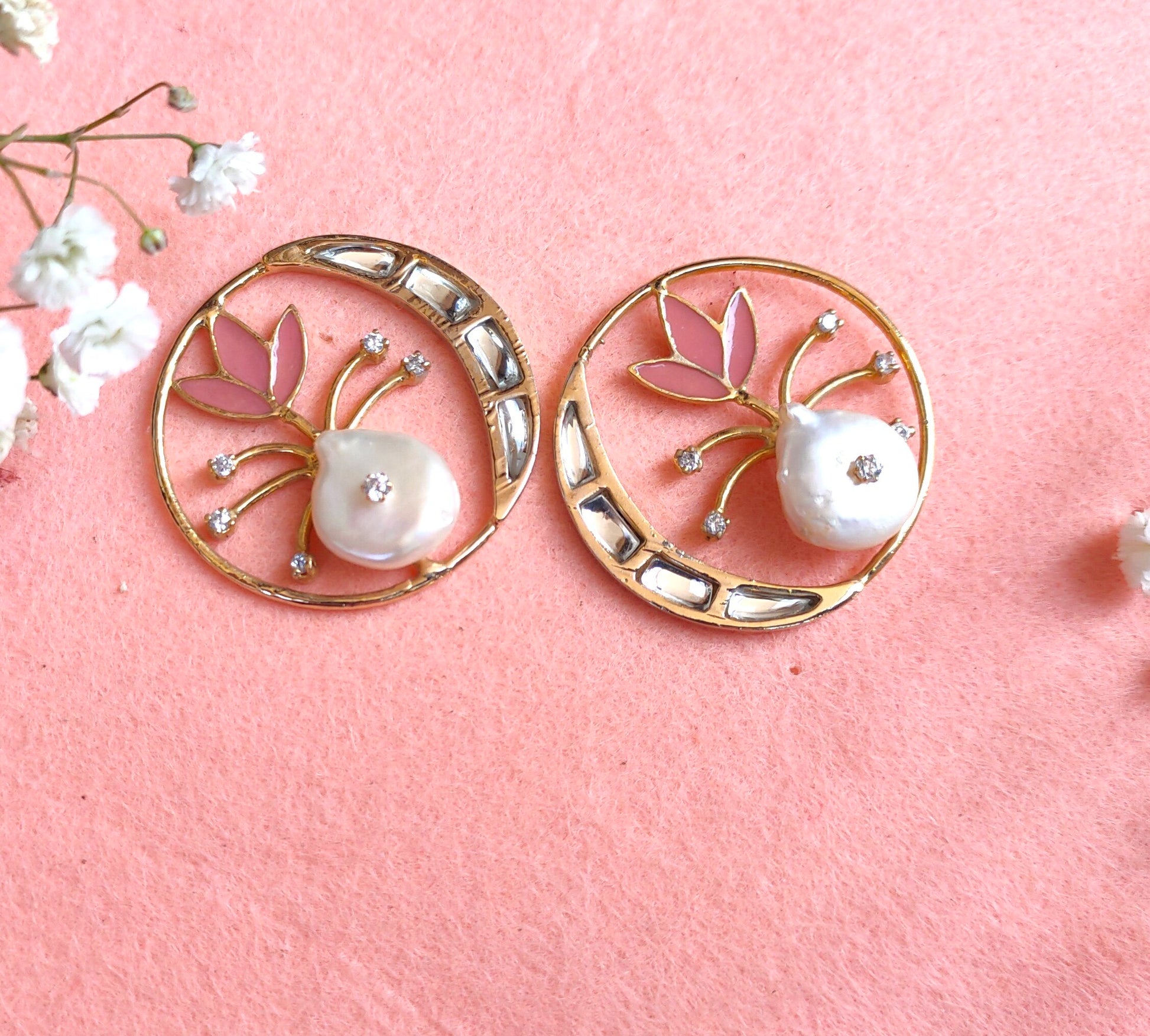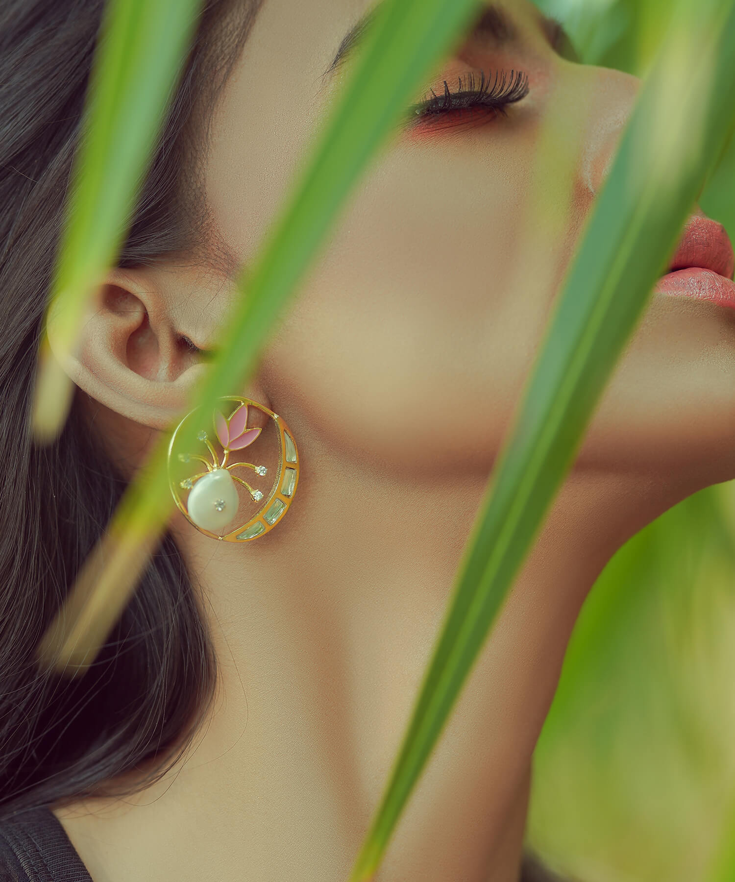 This piece bridges the gap between hand-drawn art and jewelry-making, encasing Drop Pearl, Zircon and Kundan, they symbolize nature, harmony and balance.