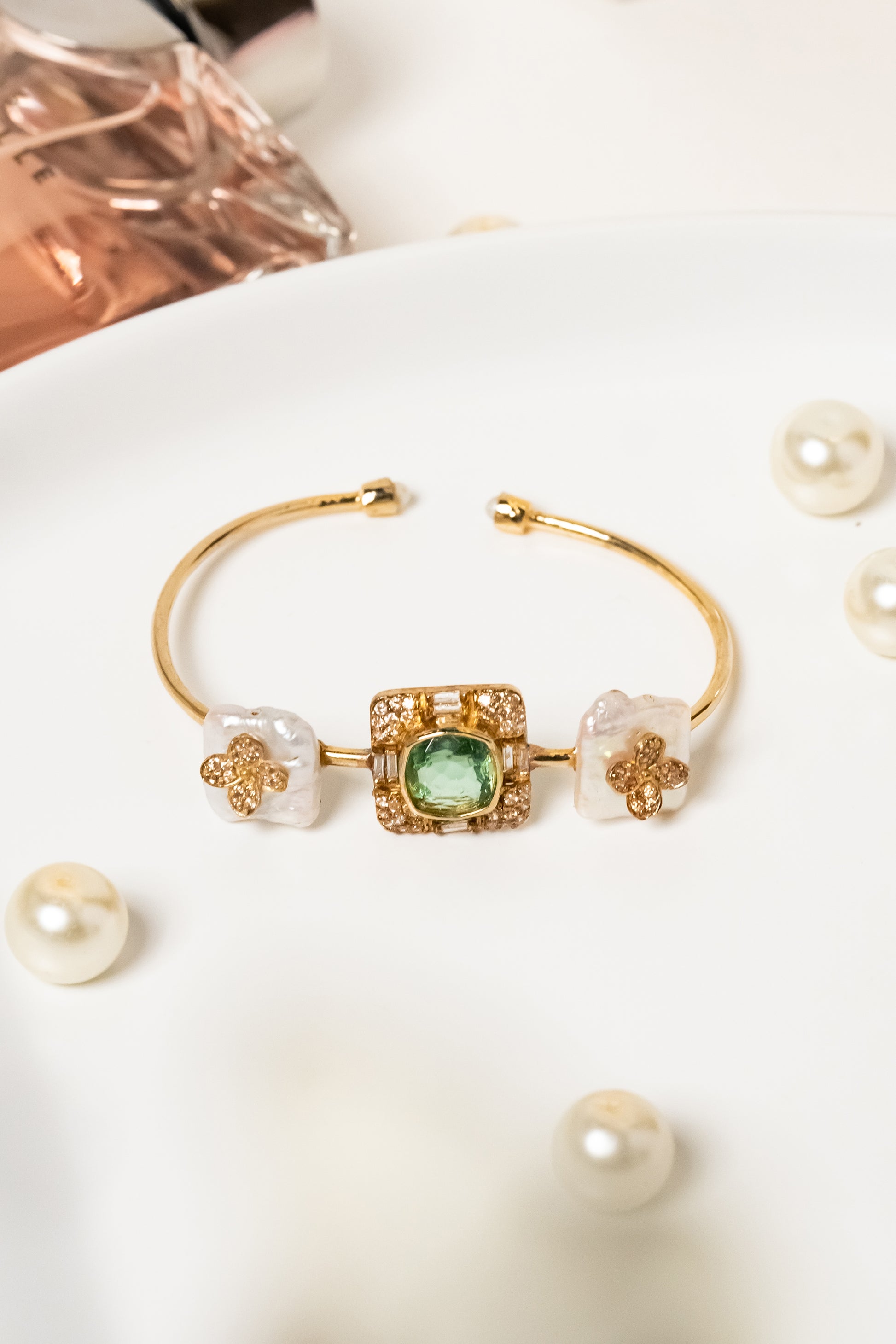 The green stone is further highlighted with the combination stone setting of clustered zircons and baguettes around it.