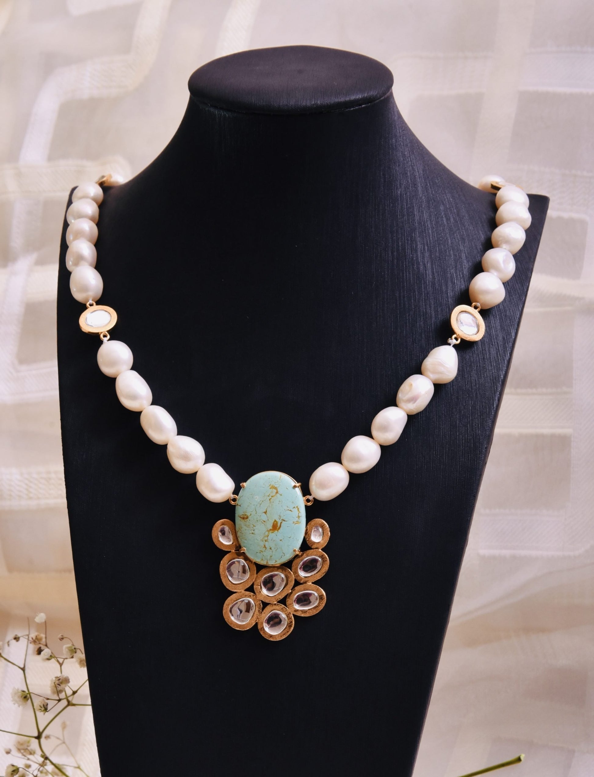 Flicker is a beautiful statement necklace, that elegantly follows the neck. It’s lined with pearls and kundan beads and punctuated in the center by a beautiful handpicked Iranian Turquoise. The stone is set in gold matte finish to highlight the color of the stone and allow for maximum sparkle.