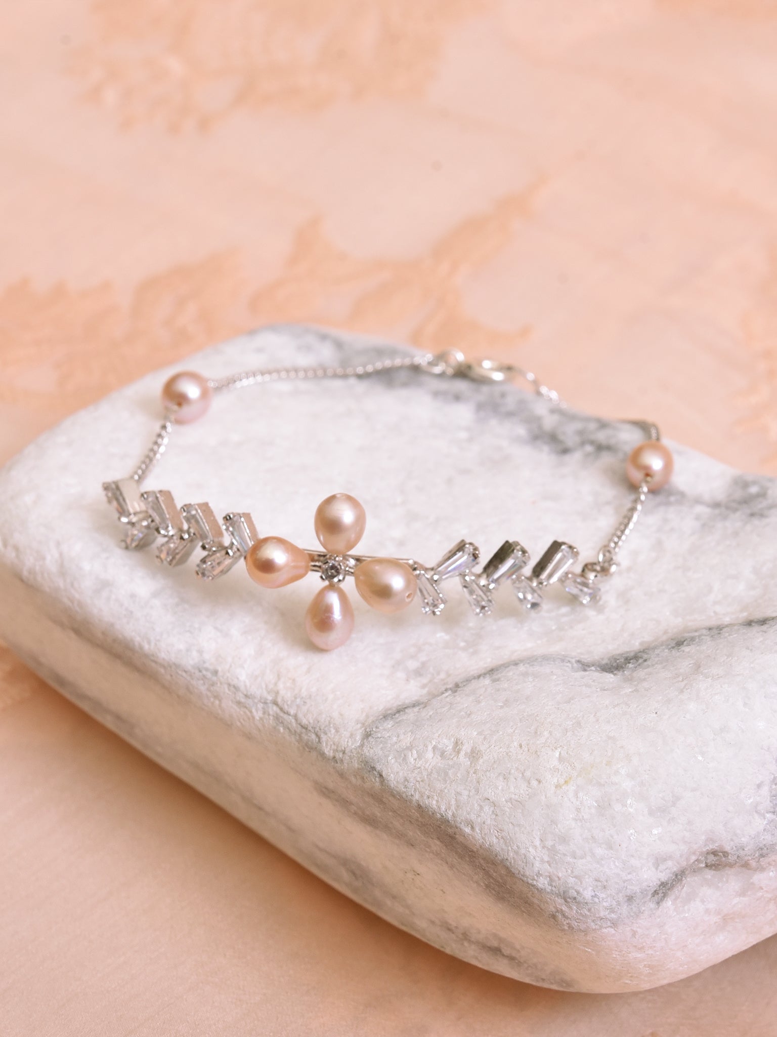 Brighten your day with the perfect doze of glamour. This peachy pink floral bracelet with zirconia baguettes is beautifully handcrafted on 925 Sterling Silver