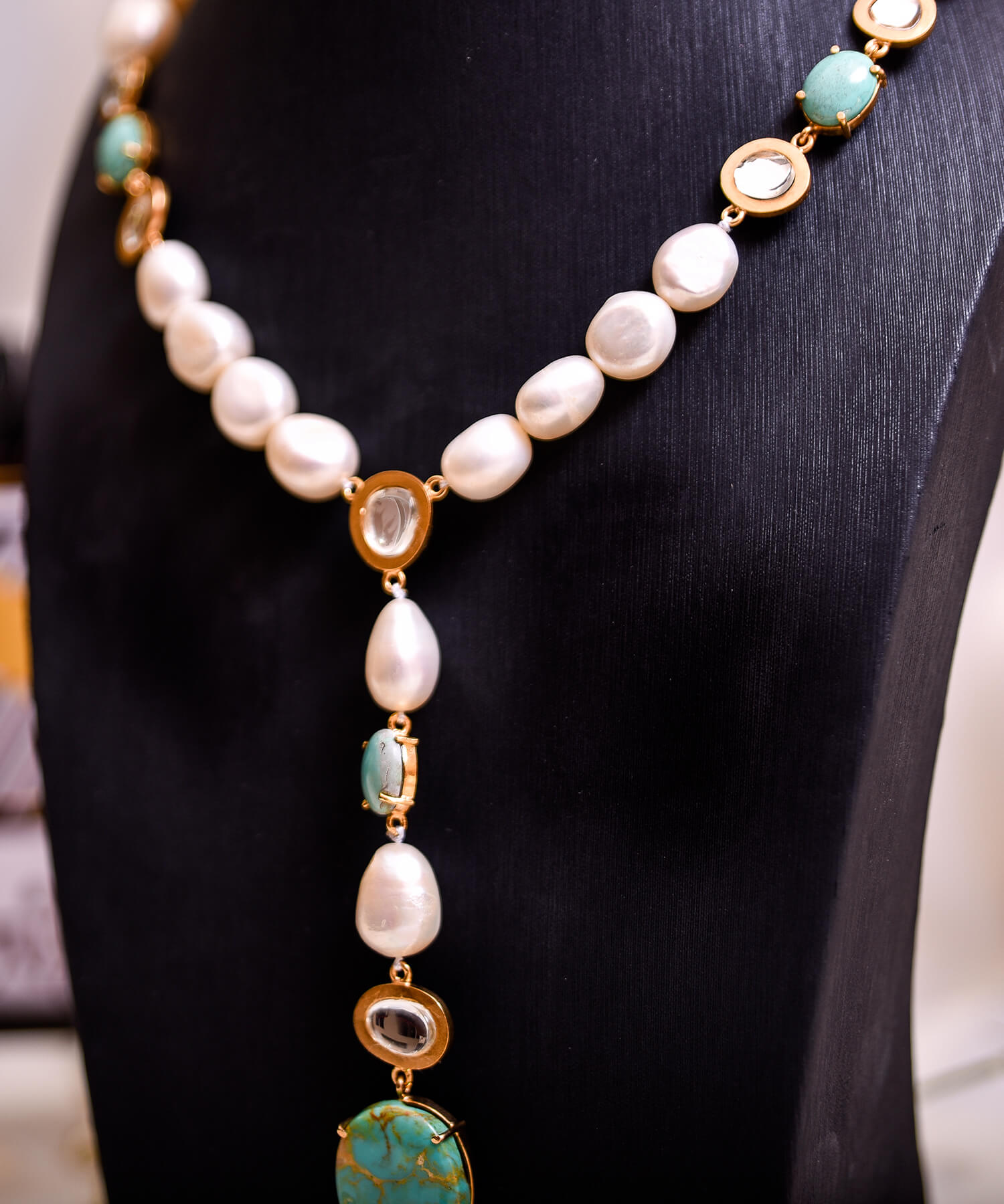 Gleam in the aura of this alluring carcanet. A rhapsody of detailed embellishments featuring Natural Turquoise, Kundan and Oval Freshwater Pearls render a soft and magnificent look.