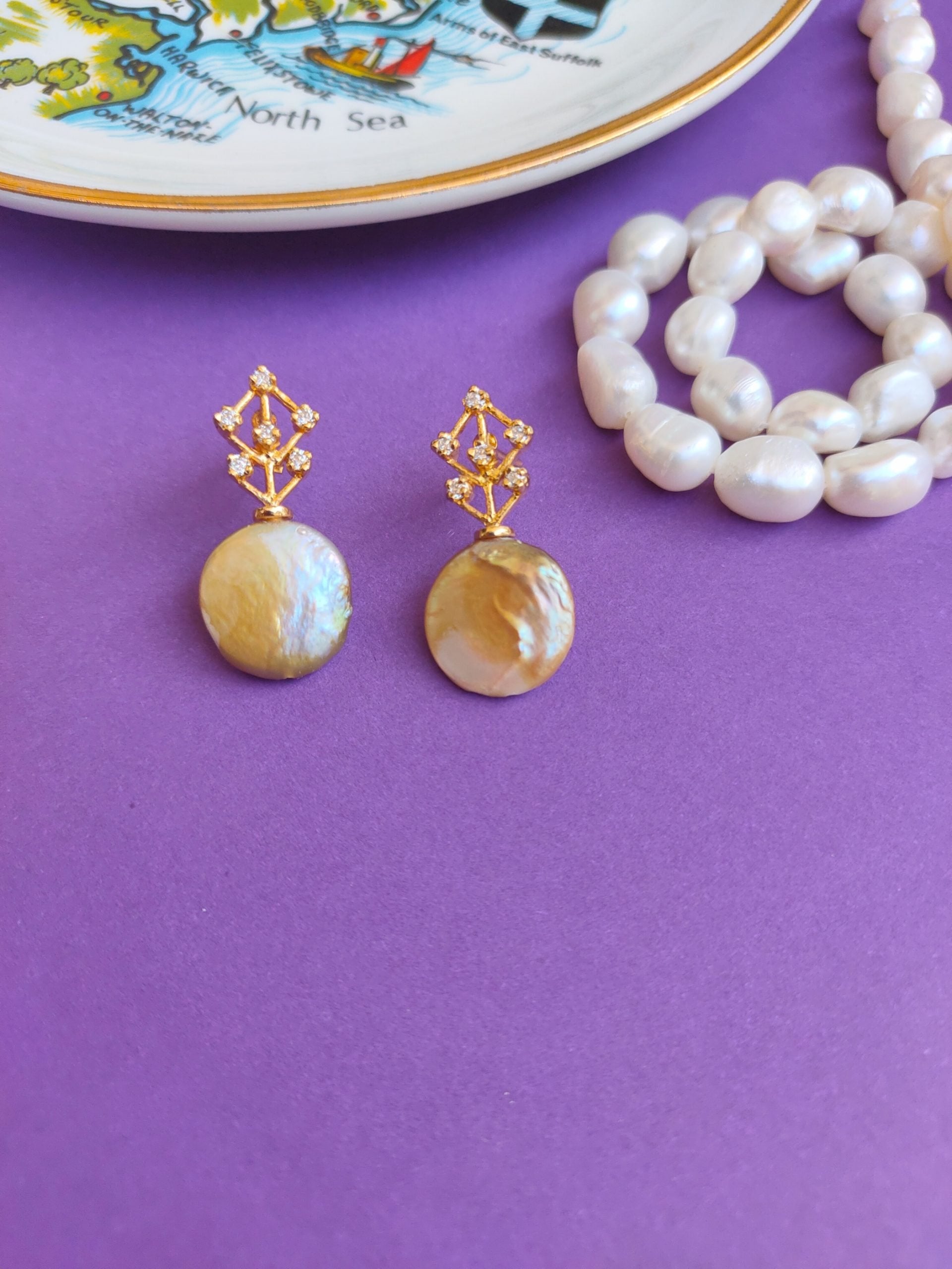 A rendition of our signature Leaf earrings. Studded with shiny Zirconiums and beautiful Gold Coin Pearl with the most stunning natural color and luster.