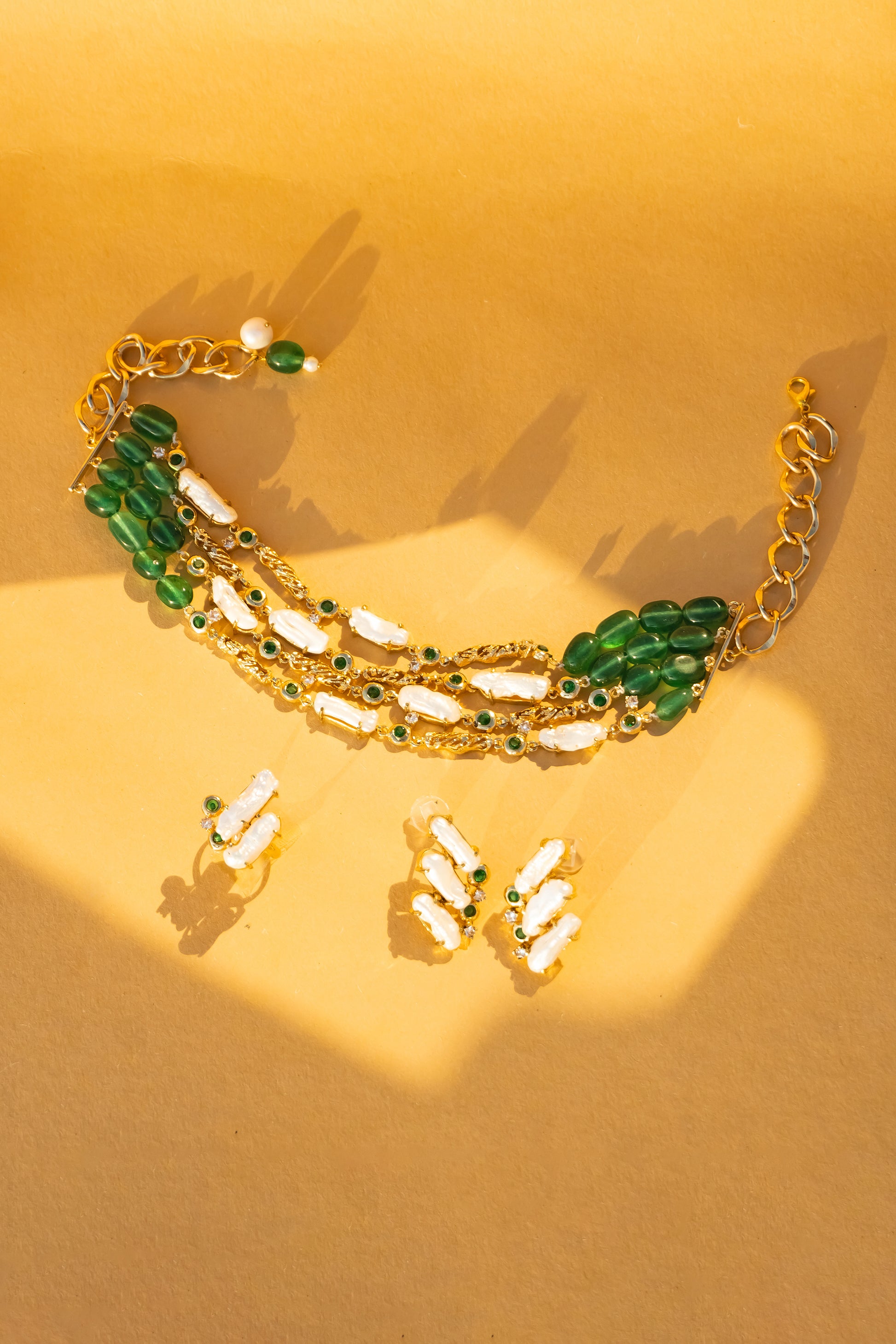 Pair up the irresistible Green Ivy choker with matching earrings designed with Green Crystals Stones and Real Freshwater Biwa Pearls elegantly wrapped around your neck to add just enough bling to make a statement.