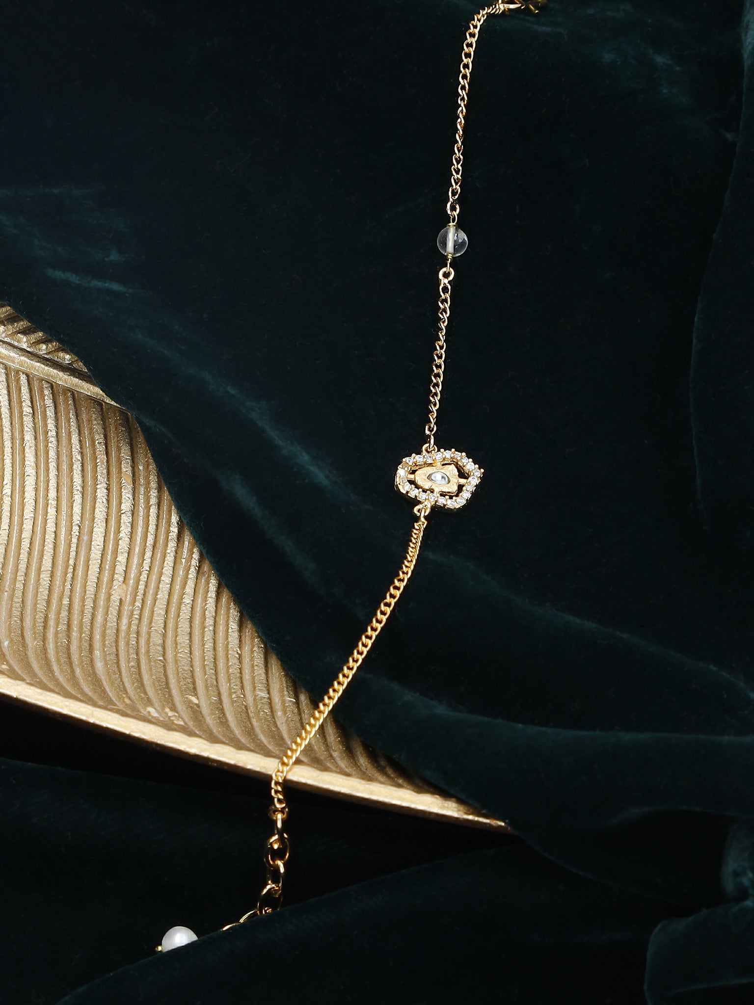 The Hafsa chain bracelet combines textured metal with natural golden topaz stones and intricate kundan detailing. Its refined design exudes elegance and sophistication, making it a timeless statement piece for any occasion.
