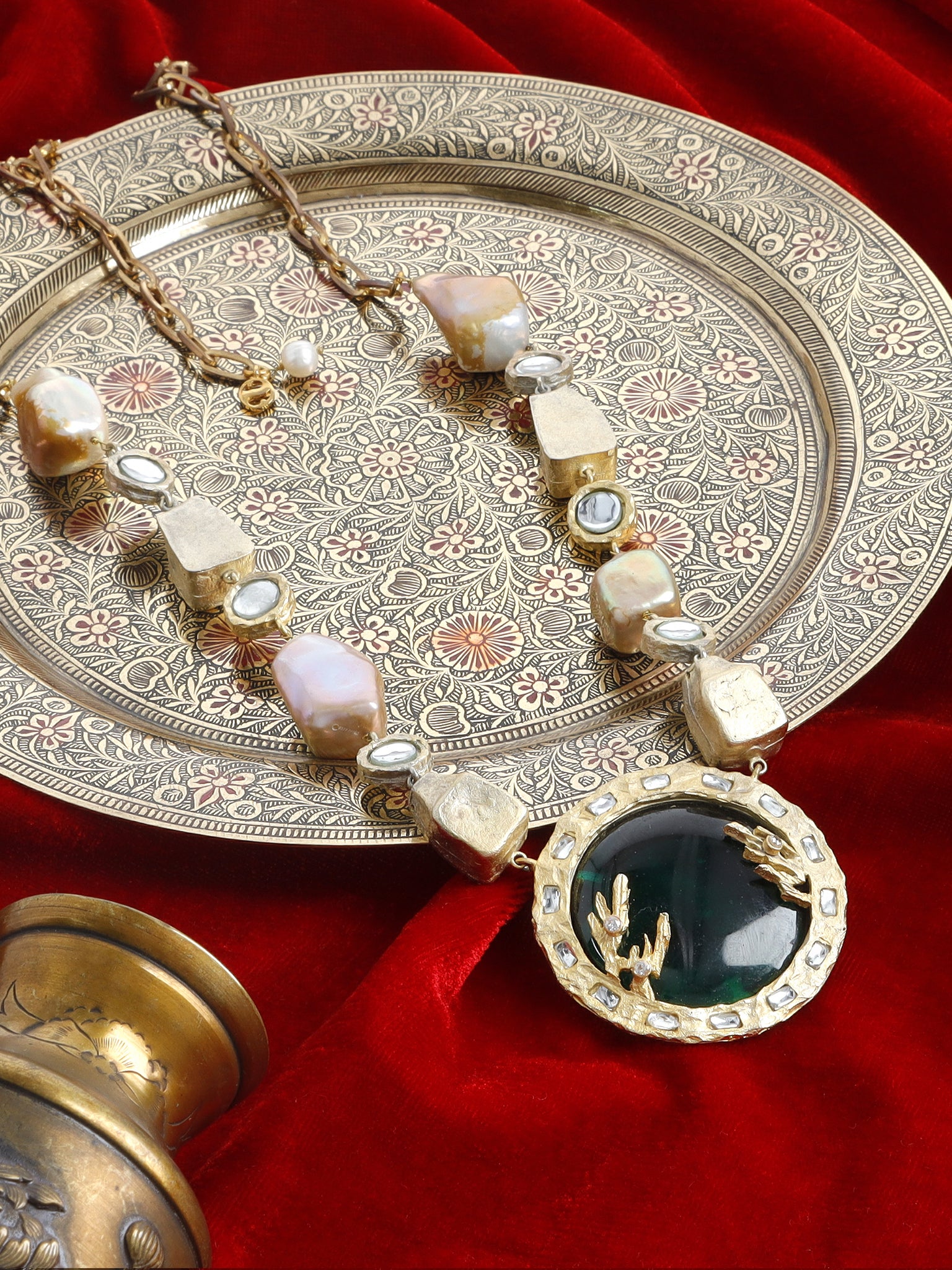 The Hurrem necklace features stunning natural baroque pearls paired with a cabochon green stone, set in textured metal with an antique finish. Adorned with kundan and zircon accents, this piece exudes timeless elegance and opulence, perfect for adding a touch of luxury to any outfit.