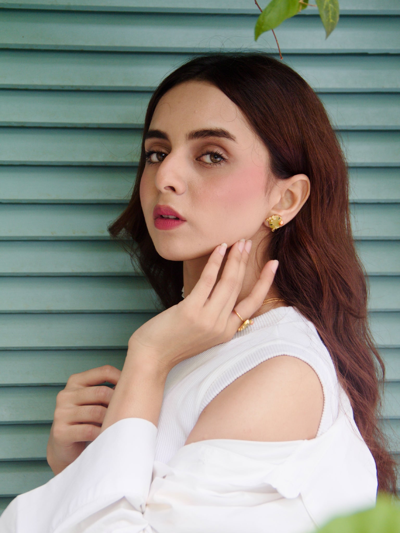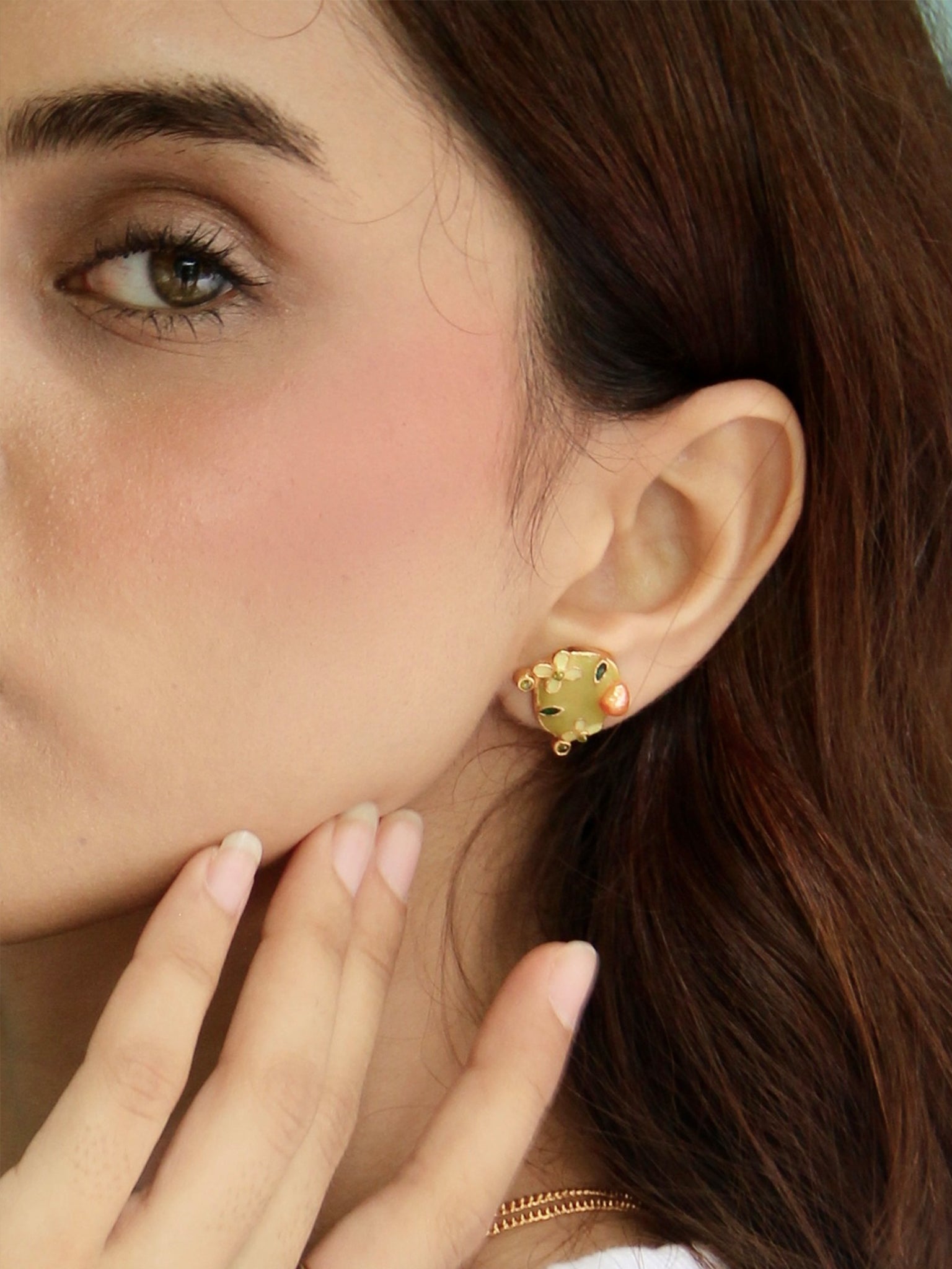 The limelight delicate gold earrings feature a subtle, whimsical design, with a gold base adorned with a small orange accent and intricate details.