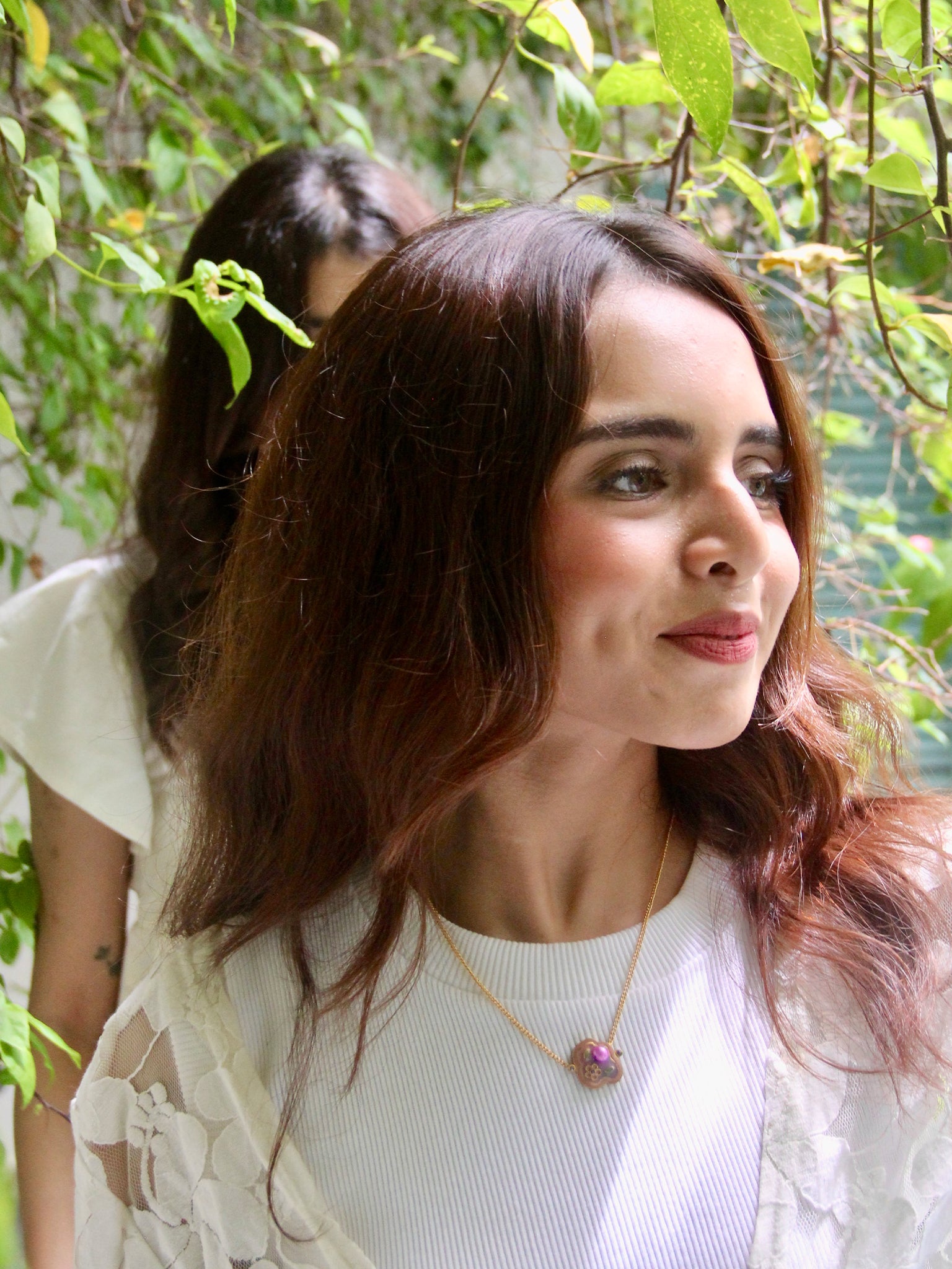 This elegant layered necklace features a delicate gold chain with a minimalist knot pendant on the inner layer and a vibrant, multi-gemstone cluster pendant on the outer layer. The subtle color palette and unique design make it perfect.