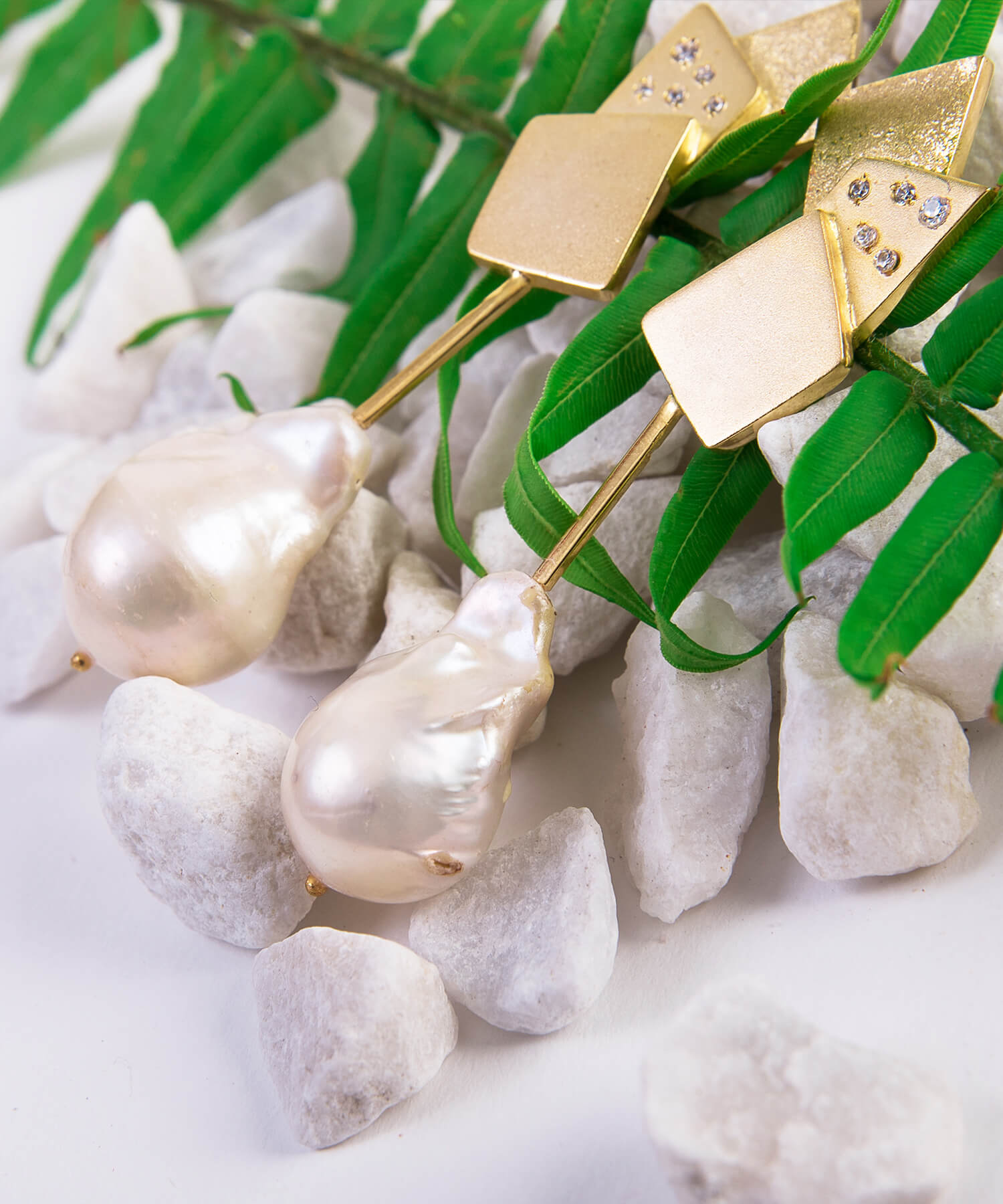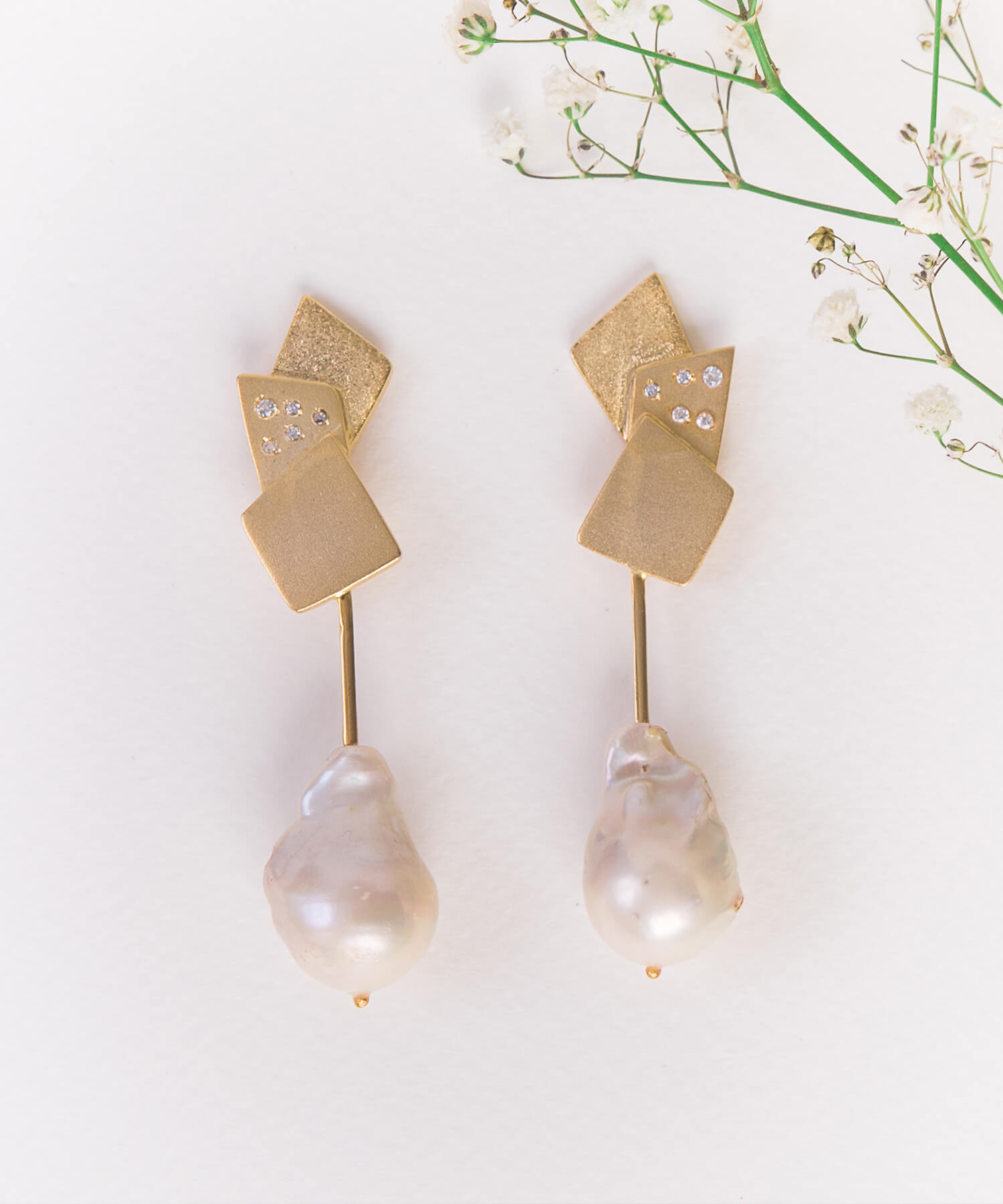 It's exquisite linear design is a treat to the eyes. Geometrical blocks embellished with zircons along with a Baroque pearl dangling at the bottom creates a unique combination of different shapes.