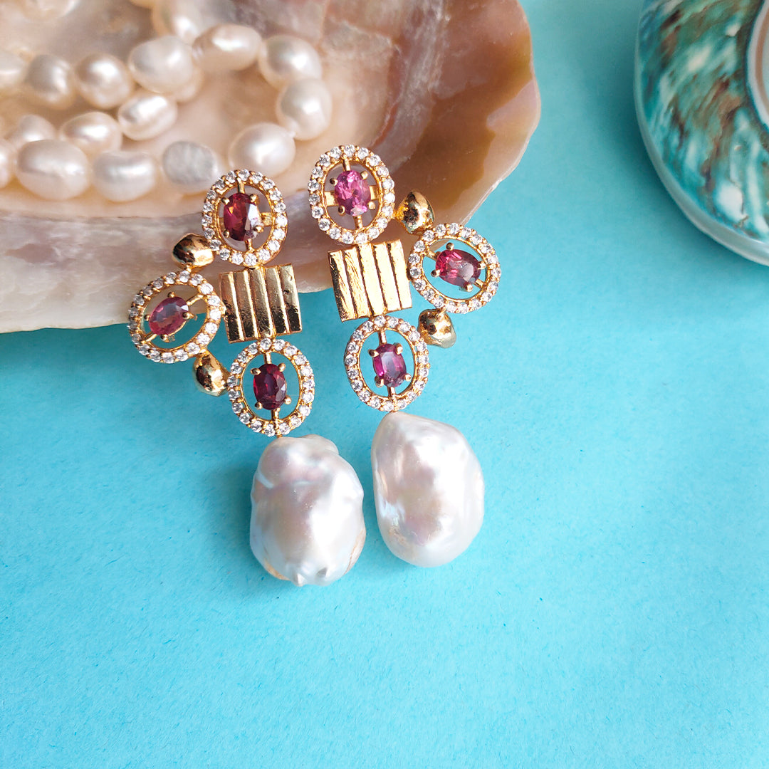 Orbit is expertly crafted to add brilliance to your look. It exhibits grandeur through it's intricate design featuring Pink Tourmaline, Baroque Pearl and studded Zircons.