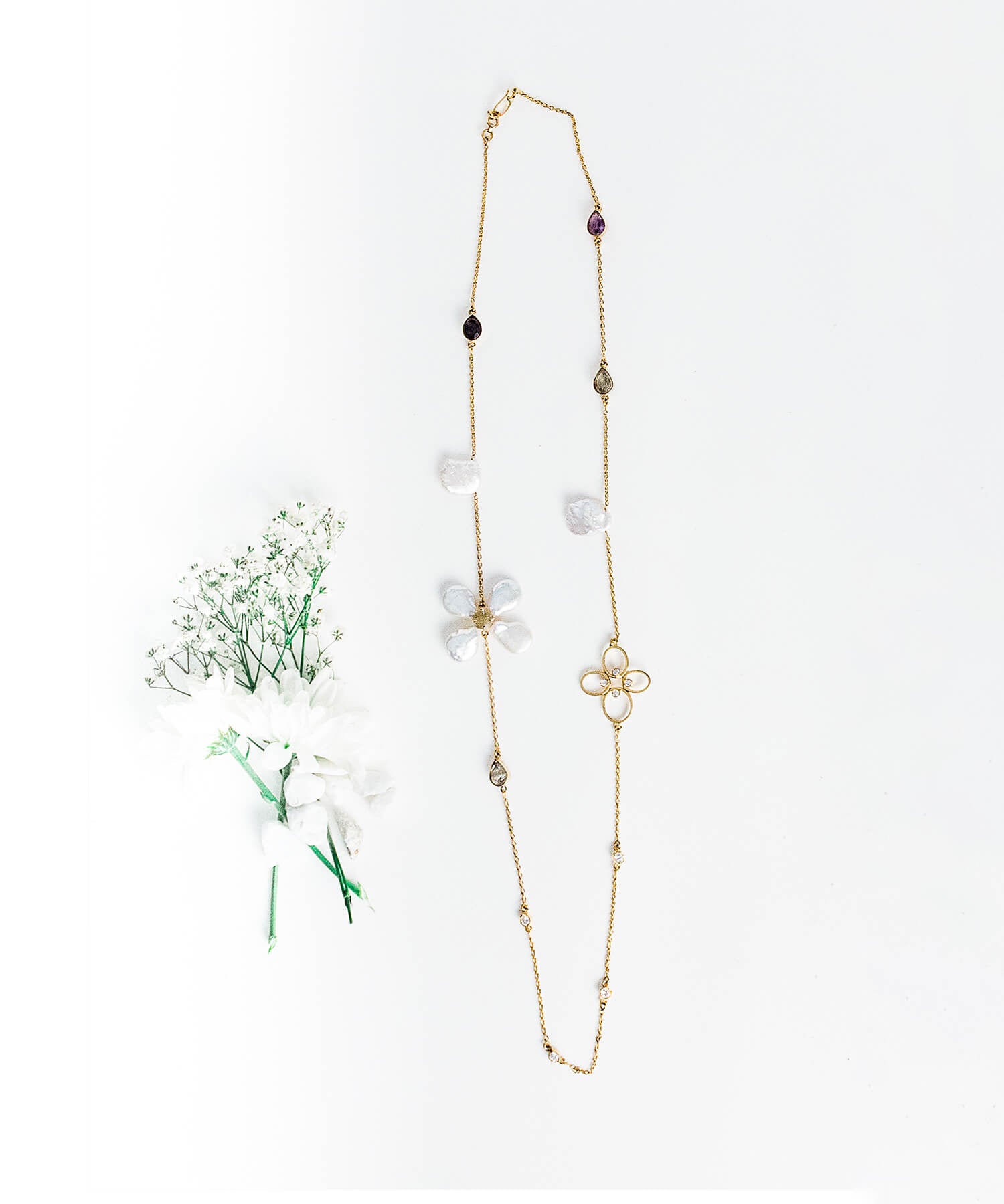 Long statement embellished necklace, you will not see anywhere else! This design is a cross between Boho-chic and Vintage style, featuring Natural Amethyst to Golden Topaz and all the beauty in between!