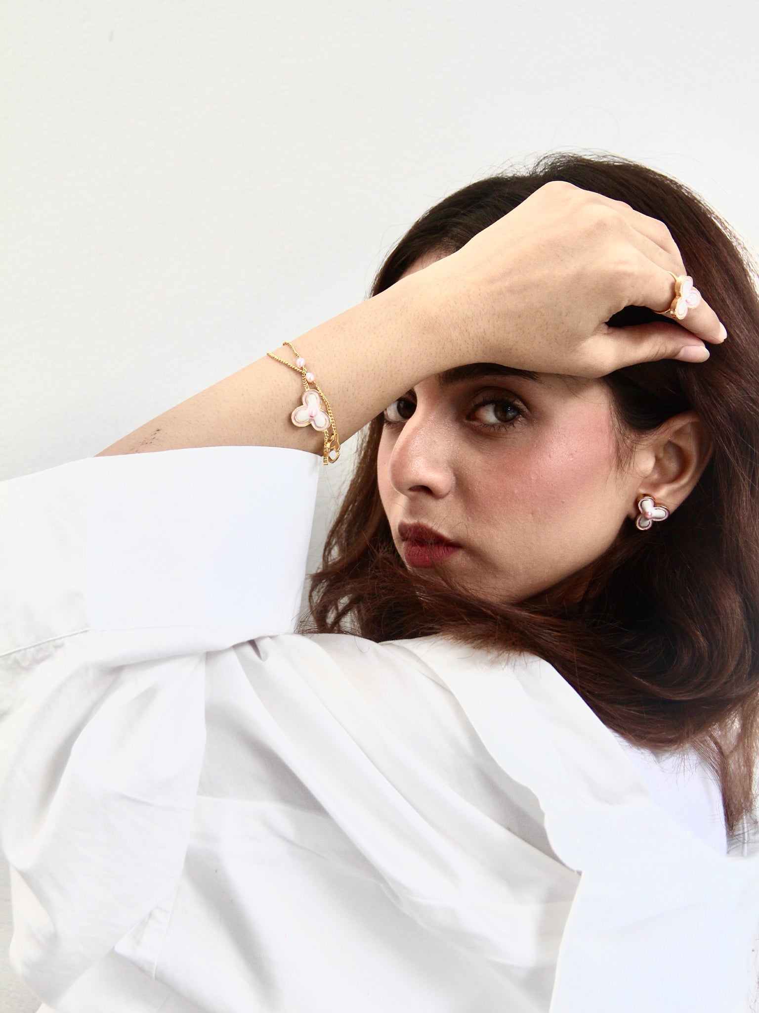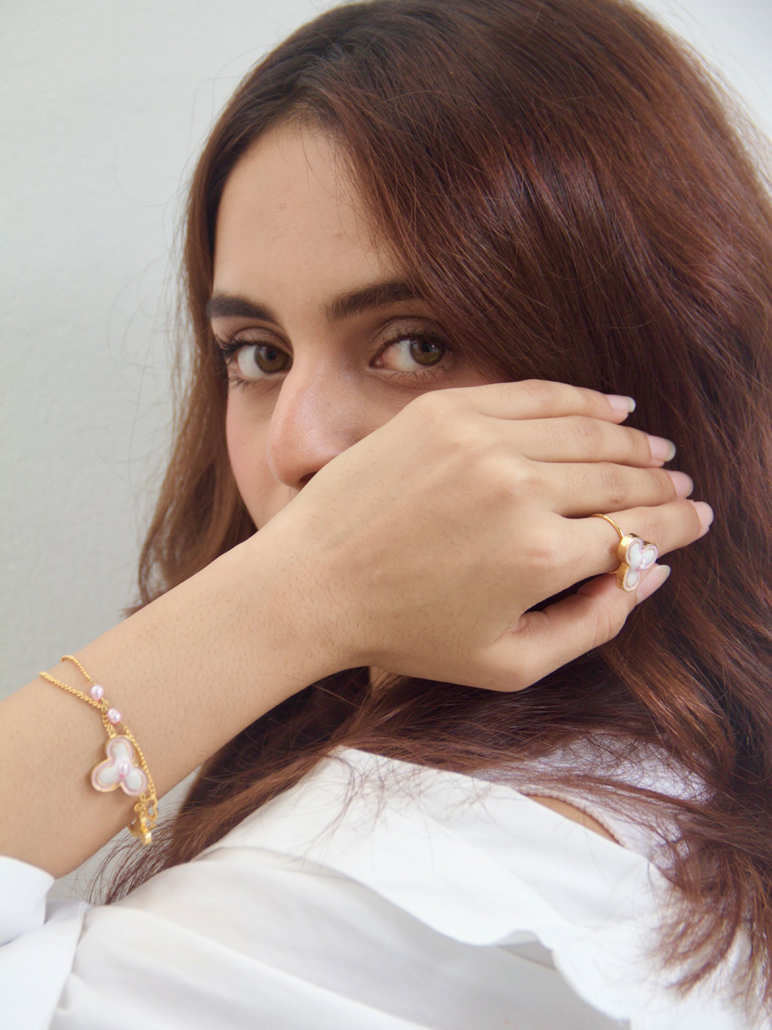 This set features two gold chains adorned with pink beads and charms, creating a minimalist yet eye-catching look. The top chain boasts a beautiful clover charm, while the bottom chain showcases a heart-shaped charm, both adding a playful and whimsical touch. The soft pink hues and subtle design elements evoke a sense of serenity and sweetness.