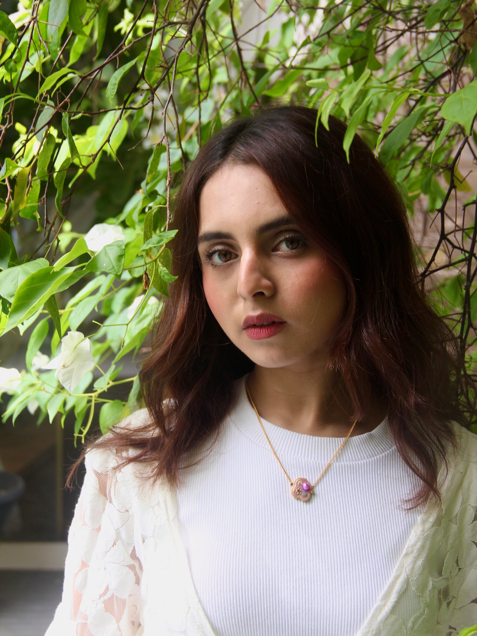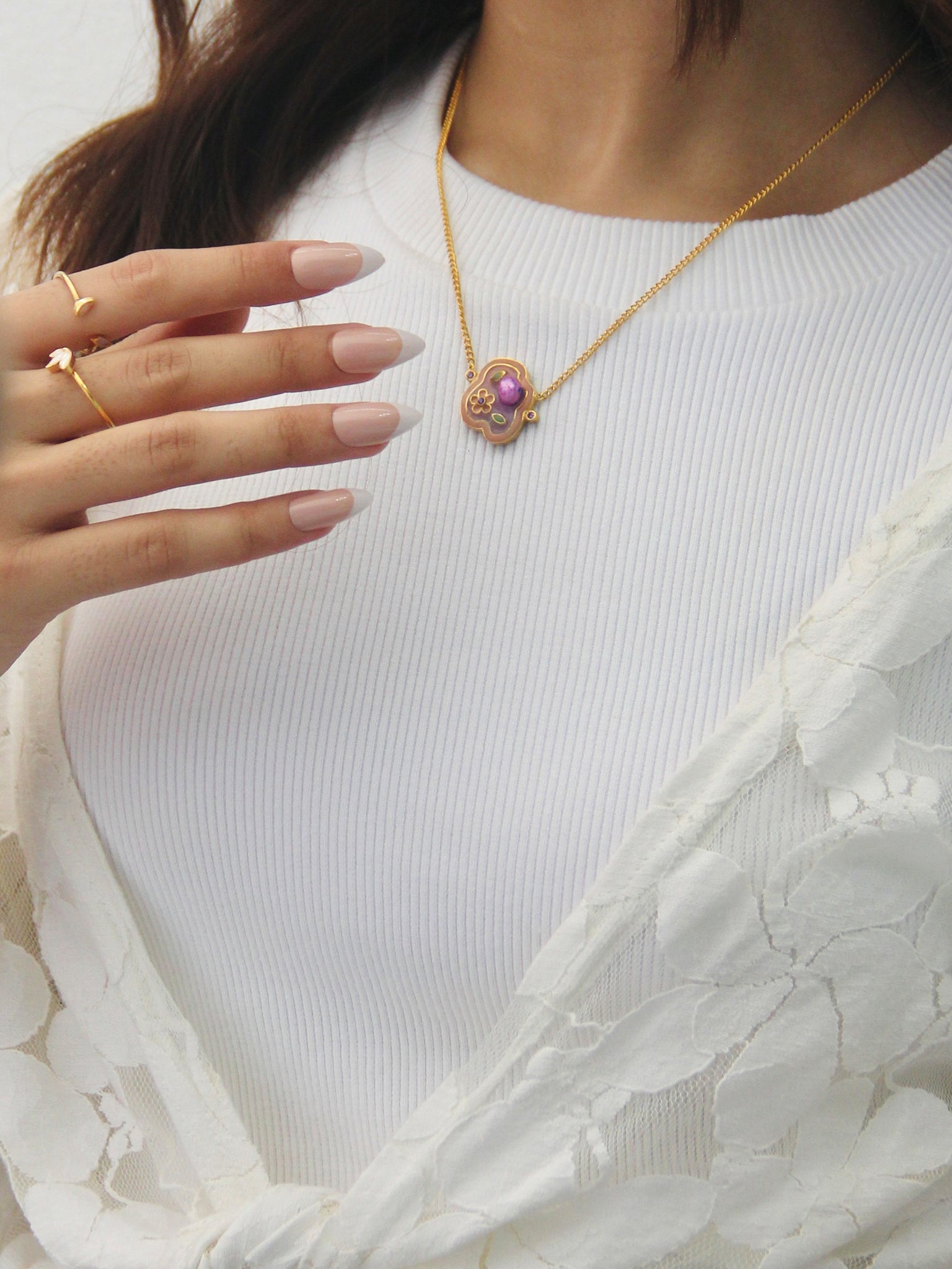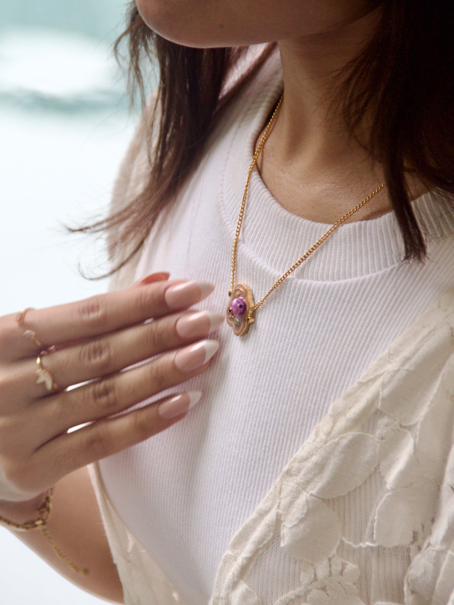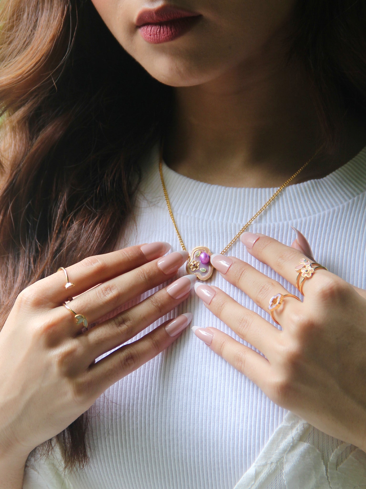 Elevate your style with the Plum Rose Necklace Set from our Painted Shore Collection. This elegant layered necklace features a delicate gold chain with a small flower pendant and a statement piece adorned with a pink floral design, accented with subtle gemstones. Crafted with precision and attention to detail, this necklace set is perfect for adding a touch of colour to any eastern or western styles!