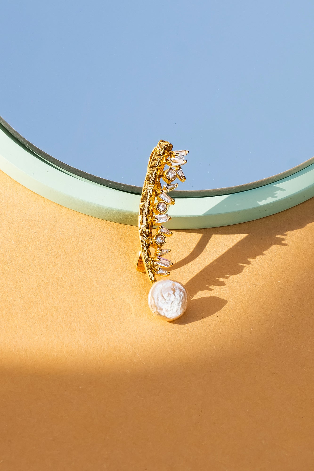 Elevate your look by adding the classic crescent to your hair, delicately studded with the setting of shiny tapers and baguettes, and a freshwater coin pearl at the bottom. You will get the perfect balance of elegance and bling to your outfit.