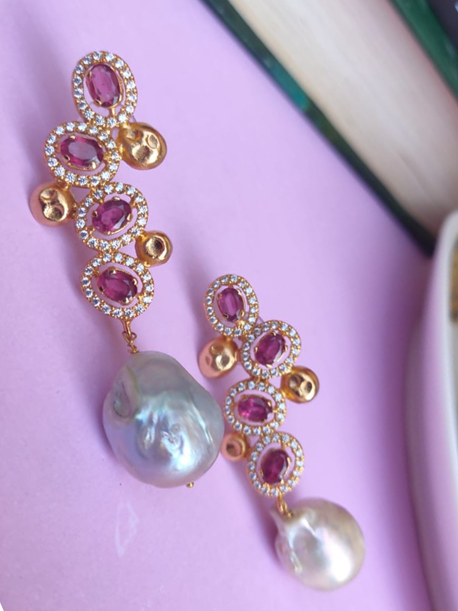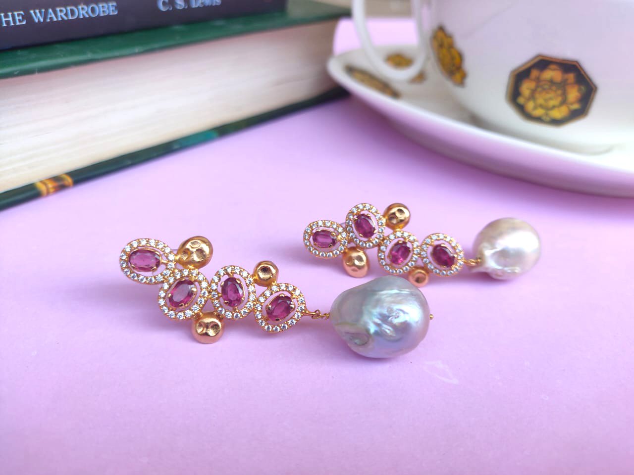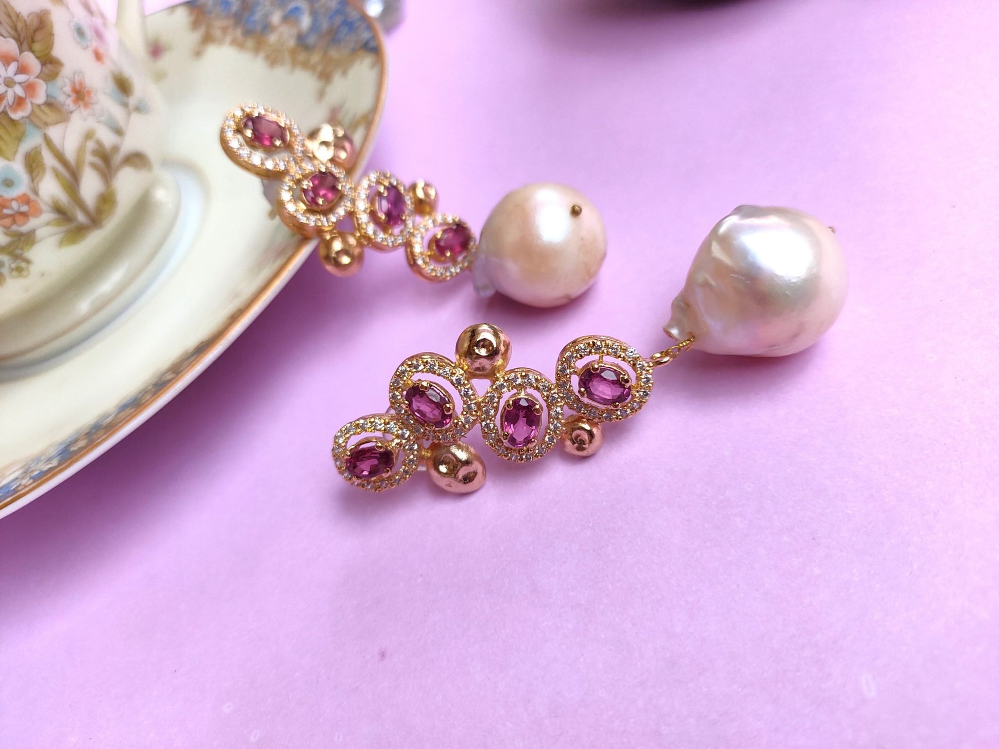 Crisp Pink Tourmalines accented with rings of sparkly zirconium, mounted on sterling silver. Further glorified by beautiful luminous Baroque Pearls