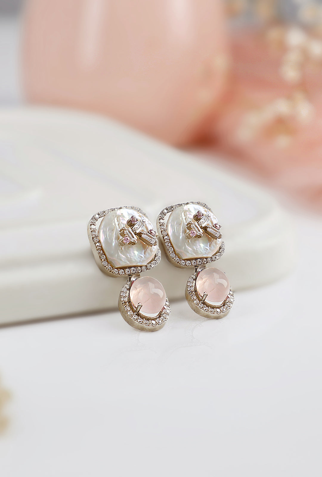 These gorgeous earrings feature flat square pearls along with hand set rose quartz gemstone. The earrings are beautifully simple and can be perfectly styled with other rose quartz pieces from the Bloom collection.