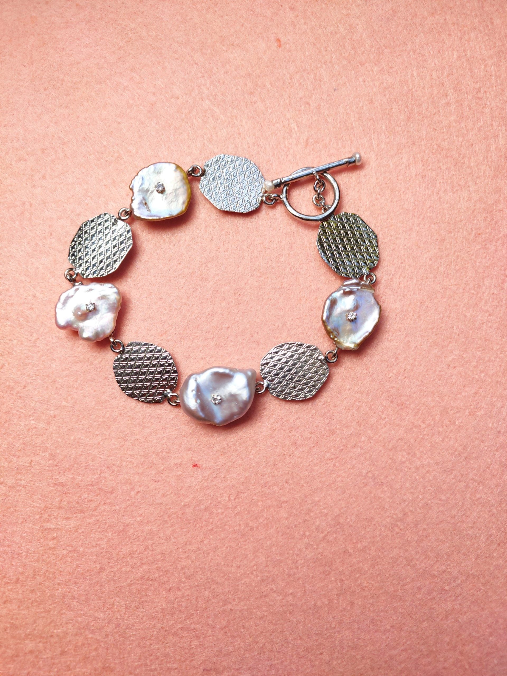 This delicate and stylish bracelet is set in Rhodium Plating. The intricate pattern and the irregular shape of Keshi pearls make a lovely combination.