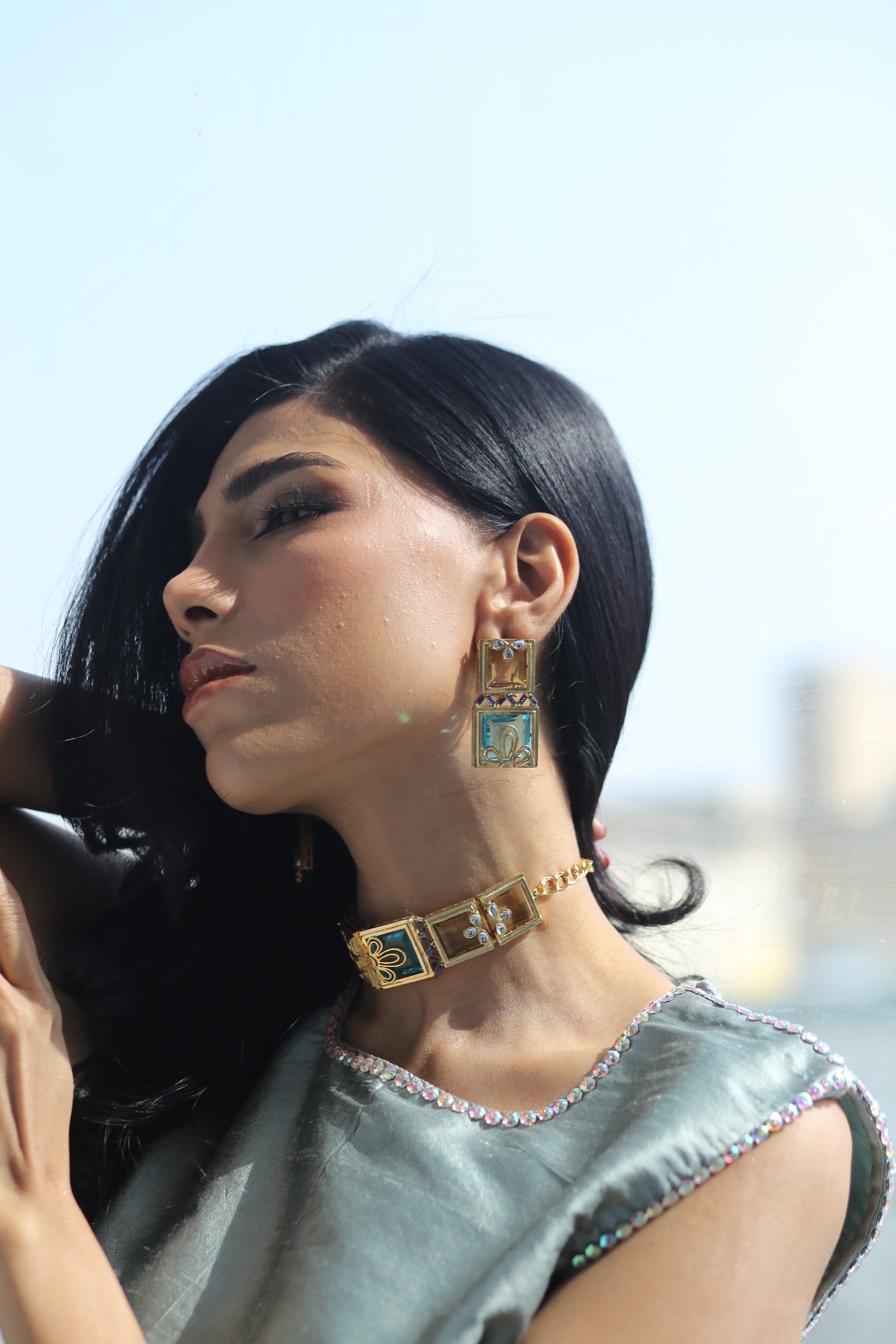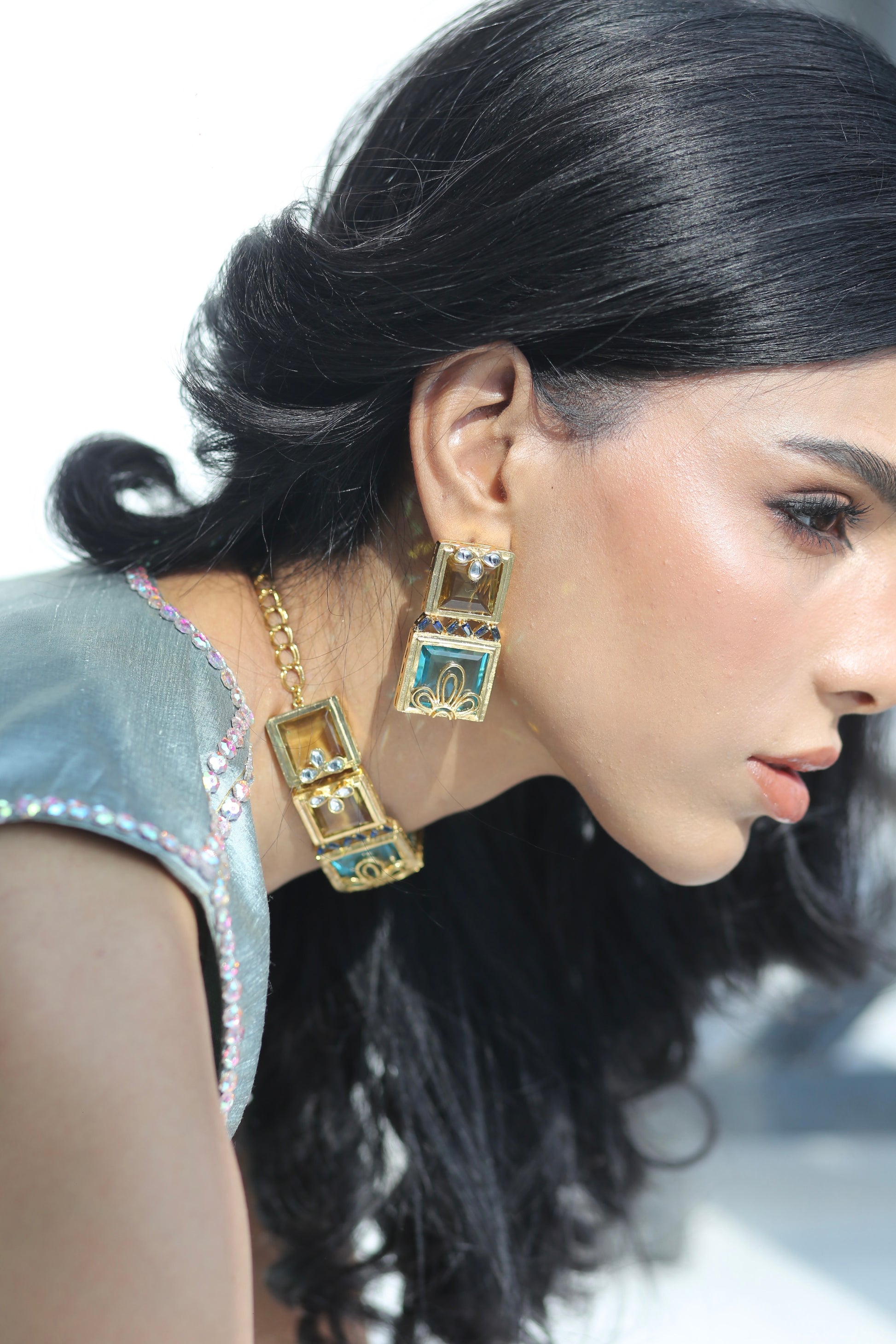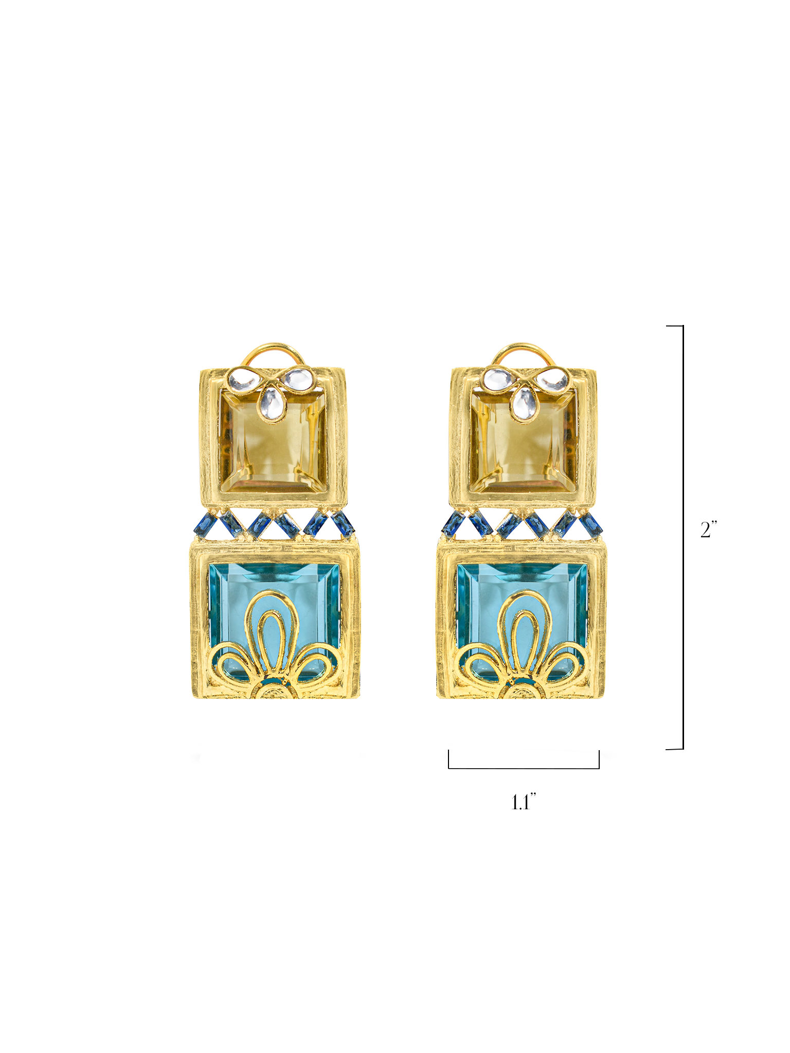 These Aqua Gleam earrings feature elegant gold-tone frames with a striking square-cut aqua crystal at the center, framed by a decorative gold filigree design and accent baguette crystals. The cutting of the crystal gives the piece a brilliant, gleaming sparkle that catches the eye.