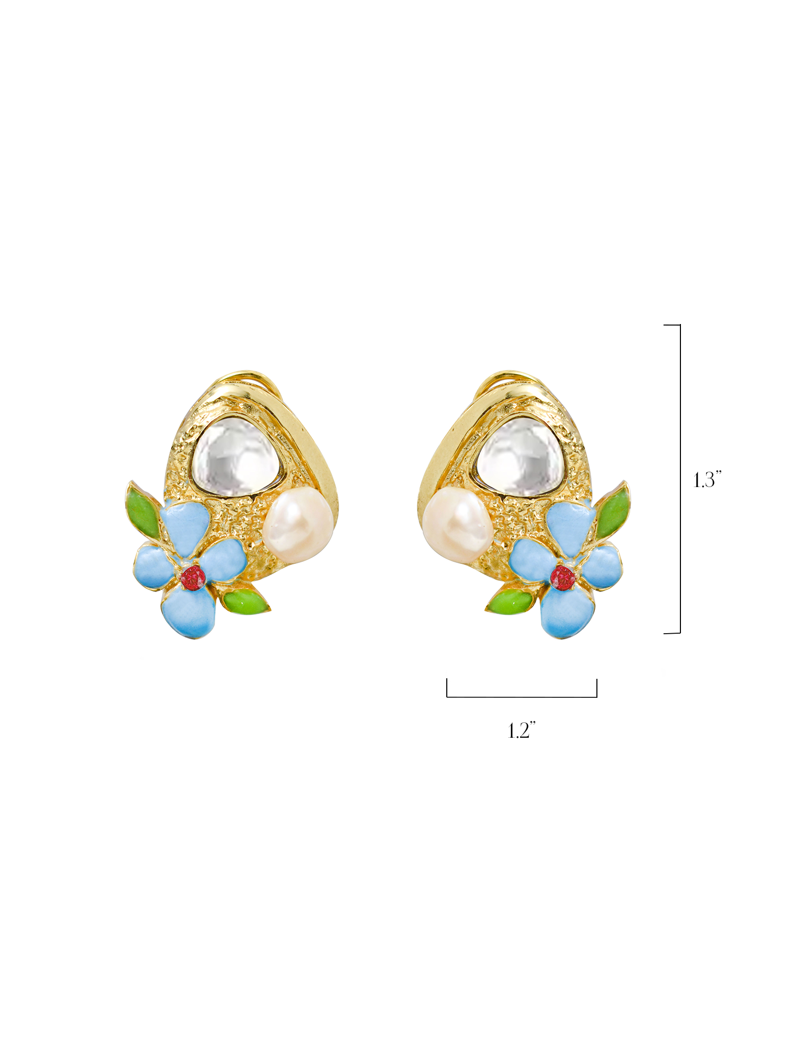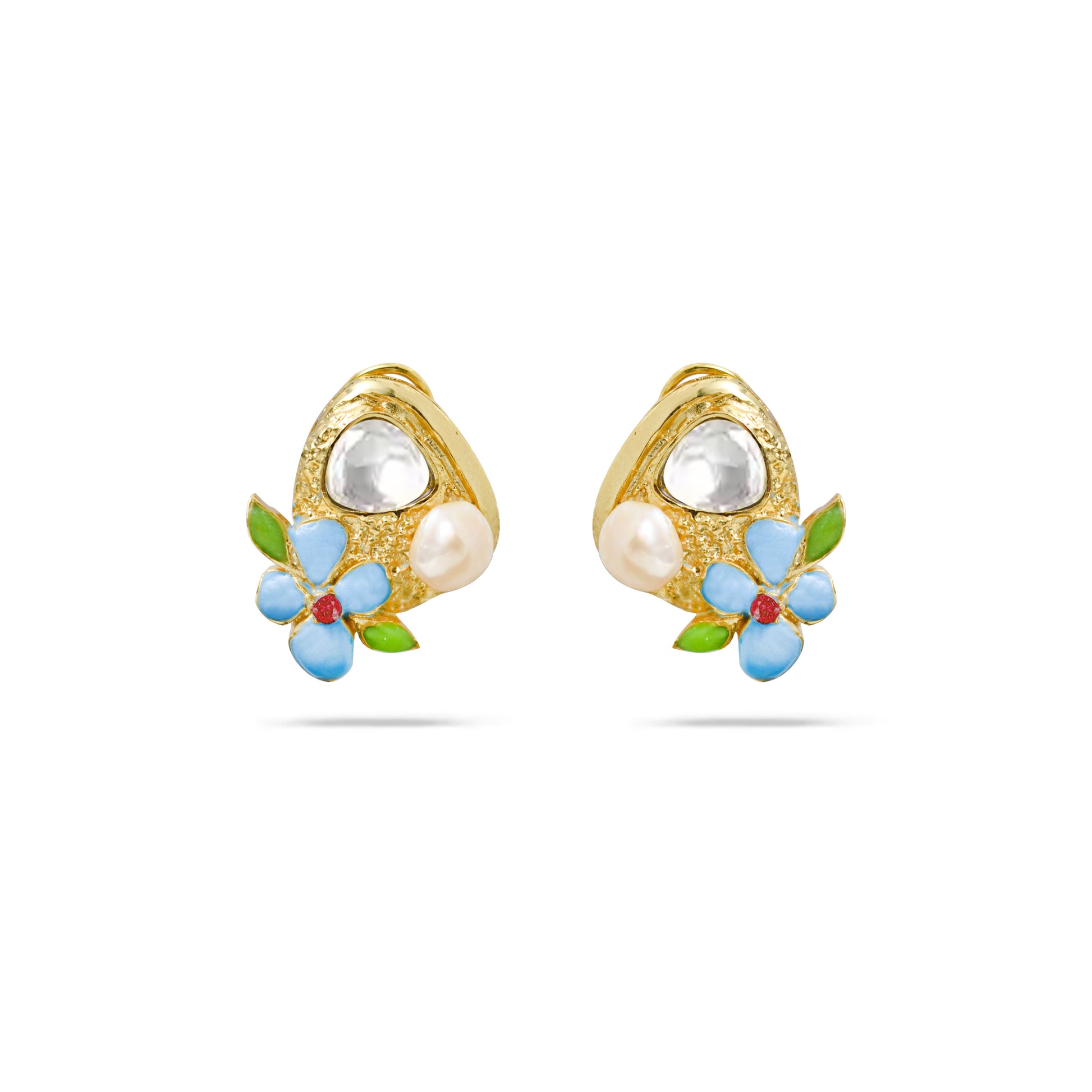 Enchanting gold earrings with a luminous pearl drop and a vibrant blue flower adorned with green leaves & a crimson heart. Blends elegance & whimsy for everyday sparkle!